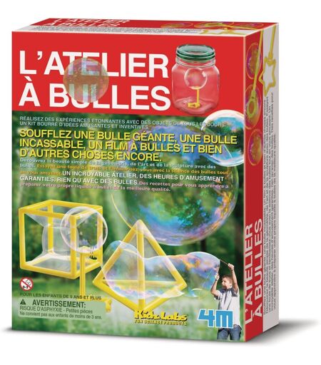 Découvrez l'univers des bulles avec ce coffret ! Réalisez des expériences étonnantes avec des objets de tous les jours. De nombreuses activités sont possibles avec ce coffret, des idées amusantes et inventives : souffler une bulle géante, une bulle incassable, un film à bulles et bien d'autres. Découvrez la beauté simple de la géométrie, de l'art et de la sculpture avec des bulles. Essayez de nombreuses choses et familiarisez-vous avec la science des bulles. Un incroyable atelier pour des heures d'amusement seul ou à plusieurs ! Contenu : - 1 plateau à bulles - 1 anneau en plastique - Fil coloré - 1 forme pyramide - 1 forme de cube - Liquide à bulles - 2 bouchons pour les baguettes à bulles géantes - Embouchure - 1 forme d'étoile - 1 forme ronde - 2 manches de baguette avec clips - 2 baguettes à bulles géantes - 2 pailles longues - Instructions détaillées. Dimensions de la boîte : 17 x 6 x 21.5 cm. Note : Certains outils sont nécessaires pour la réalisation des expériences mais ne sont pas inclus dans le coffret :du papier ordinaire, du ruban adhésif, une paire de ciseaux, des gouaches, un pot/un récipient, un bol gradué. Age minimum : 5 ans ...