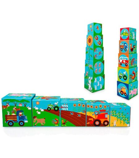Découvrez cette jolie Tour empilable de 5 Cubes sur le thème de La Ferme Cette pyramide se compose de 5 gros cubes en carton épais de dimensions différentes. Chaque face représente différents thèmes sur la ferme : - les animaux : le lapin, la poule, le paon, le coq et le cochon - les chiffres : de 1 à 5 avec des petits animaux pour apprendre à compter - les véhicules : la voiture, le camion benne, la camionnette du laitier, le tracteur et la moissonneuse batteuse - un grand tournesol à reconstituer - un puzzle sur la Ferme, avec les vaches et les moutons dans les champs, et les fermiers au travail. Dimensions de la pyramide : 17,5 x 77 cm Age minimum : 12 mois ...