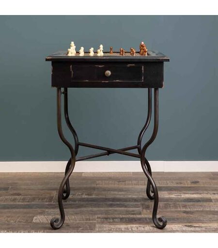 Ce guéridon jeux d'échecs est une pièce de mobilier unique qui allie fonctionnalité et esthétisme. Fabriqué en bois de sapin , ce guéridon arbore une finition vieillie qui lui confère un charme rustique et authentique . Son plateau de jeu noir , légèrement patiné , est parfaitement dimensionné pour une partie d'échecs conviviale , transformant ce meuble en un véritable terrain de jeu . Le guéridon repose sur des pieds élégants , aux lignes travaillées, qui ajoutent une touche de raffinement et de solidité . Un petit tiroir est intégré au guéridon , il est orné d'une poignée décorative , permet de ranger les pièces du jeu une fois la partie terminée, préservant ainsi l'harmonie de votre intérieur. Ce meuble polyvalent peut également servir de table d'appoint ou de chevet , s'intégrant parfaitement dans un salon , une bibliothèque ou même une chambre . Il est idéal pour ceux qui aiment allier la passion du jeu à la beauté du mobilier artisanal . Dimensions : 68x46x46cm Chehoma Placez ce ...