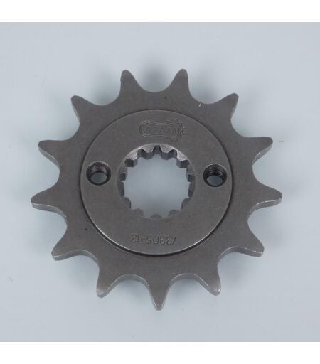Pignon de sortie de boîte 13 dents en acier neuf de marque Afam. Caractéristiques : - Nombre de dents : 13 dents. - Pas : 520. - Diamètre intérieur cannelures : 18.5mm. - Diamètre extérieur cannelures : 22mm. - Nombre de cannelures : 13. - Fixation par deux trous filetage M6 pas 100 entre axe 34mm. - Épaisseur au niveau de la chaîne : 5.9mm. - Épaisseur au niveau des cannelures : 8.8mm. - Déport : Non. - Trou pour le capteur de vitesse : Non. Vendu à l'unité. Livré conforme à la photo. ...