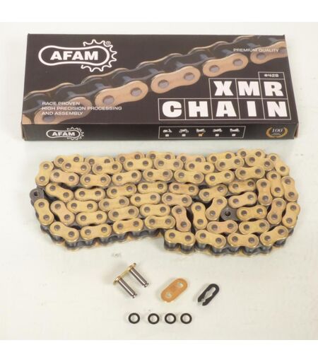 Chaine de transmission renforcée à joints toriques neuve adaptable de marque Afam référence 'A428XMR2-G 120L' coloris or. Caractéristiques : - Marque : Afam - Référence : A428XMR2-G 120L - Nombre de maillons : 120 - Pas de chaine : 428 - Longueur totale : 152cm - Type attache : attache rapide à clips avec 4 joints toriques - Qualité : Renforcée Vendue nue à l'unité. Livrée conforme à la photo. ...