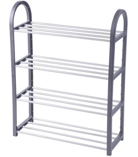 Rangement pour chaussures en métal et plastique 4 étages, 8 paires. Dimensions : Hauteur 66cm x Longueur 50cm x largeur 19cm Couleur : Chrome et Gris Matière : Métal et Plastique ...