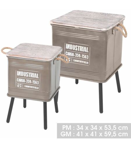 Apportez du caractère à votre pièce avec ces deux tables d'appoint en métal. Leur design en forme de caisse se mariera à la perfection avec les autres meubles de votre pièce. FICHE TECHNIQUE - Structure des tables en métal. - Plateau imitation bois. - Poignées en corde. - Lot de 2. CARACTERISTIQUES TECHNIQUES - Dimensions de la grande table : L. 41 x l. 41 x H. 59 cm. - Dimensions de la petite table : L. 34 x l. 34 x H. 53 cm. - Poids : 7,2 kg. ...