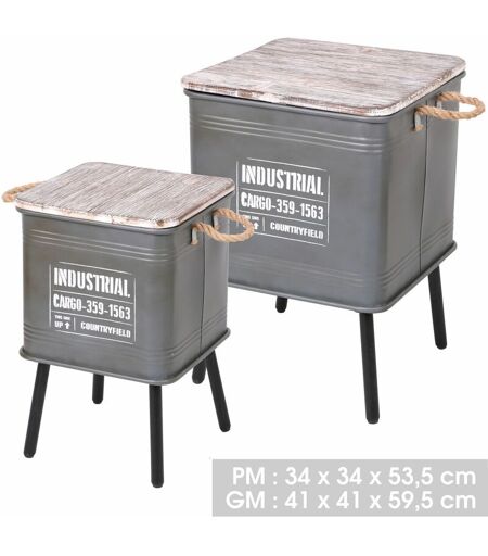 Apportez du caractère à votre pièce avec ces deux tables d'appoint en métal. Leur design en forme de caisse se mariera à la perfection avec les autres meubles de votre pièce. FICHE TECHNIQUE - Structure des tables en métal. - Plateau imitation bois. - Poignées en corde. - Lot de 2. CARACTERISTIQUES TECHNIQUES - Dimensions de la grande table : L. 41 x l. 41 x H. 59 cm. - Dimensions de la petite table : L. 34 x l. 34 x H. 53 cm. - Poids : 7,2 kg. ...