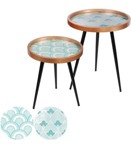 De style Art Déco, ces deux tables d'appoint rivalisent d'atouts pour intégrer votre salon. On craque pour leur structure en métal noir contrastée par un plateau aux bords dorés et aux motifs blancs et bleus. FICHE TECHNIQUE - Structure de la table d'appoint en métal. - Lot de 2. CARACTERISTIQUES TECHNIQUES - Dimensions de la grande table : Diam. 49 x H. 60 cm. - Dimensions de la petite table : Diam. 39 x H. 46 cm. - Poids : 6,3 kg. ...