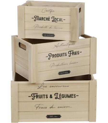 Ce lot de 3 caisses de rangement donnera une touche moderne et champêtre à votre intérieur. Matière : bois. Dimensions : petite : L 26 x P 16 x H 14 cm. moyenne : L 31 x P 21 x H 16 cm. grande : L 36 x P 26 x H 18 cm. . Couleur : Beige. Matière: Bois. Hauteur : 14,16,18 cm. Longueur : 26,31,36 cm. Profondeur : 16,21,26 cm. Gamme : Loft & Wood ...