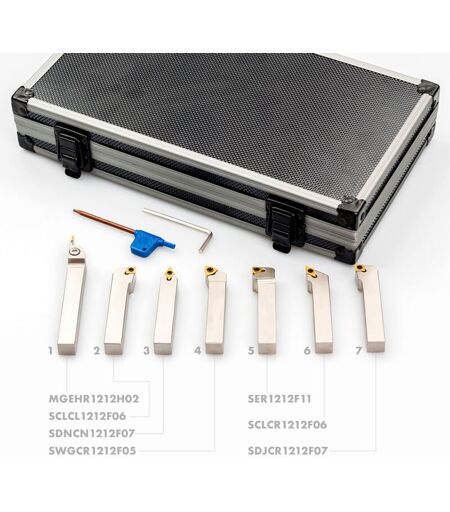DESCRIPTION: Jeu d'outils de tour de 12 x 12 mm avec plaquettes en carbure, livrés dans un coffre de rangement aluminium avec incrustations. Avantages : Chaque burin est muni d'une plaquette amovible en carbure Les plaquettes sont revêtues TiN Coffre de rangement aluminium avec incrustations Carrés 12x12 mm, longueur 80 mm Conviennent pour : Travaux de tournage dans les types métaux ordinaires Tous types de tours avec une tourelle carrée ou à changement rapide à partir de 12 mm ou plus Composé de: Porte-outils N°1: Porte-outils de tronçonnage MGEHR1212H02 longueur 100 mm - 2,0 mm Travail avec des plaquettes 790013010 - MGMN200-M Porte-outils N°2: Porte-outils extérieure gauche SCLCL1212F06 Travail avec des plaquettes 790013450 - CCMT060204 Porte-outils N°3: Porte-outils extérieure (copier) SDNCN1212F07 Travail avec des plaquettes 790013455 - DCMT070204 Porte-outils N°4: Porte-outil extérieure (charioter, dresser, copier) droite SWGCR1212F05 Travail avec des plaquettes 793441759 ...