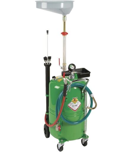 DESCRIPTION: Récupérateur-aspirateur pneumatique d'huile usagée. Cet appareil combiné permet de changer rapidement l'huile moteur dans tous les véhicules. Utilisation : Gravité - bac de 15 litres monté sur un support réglable en hauteur Aspiration - à l'aide des sondes fournies Après la dépressurisation, l'aspirateur fonctionne de manière autonome, sans besoin de raccordement continu au système d'air comprimé Avantages : Grand entonnoir ø 580 mm amovible Grille / filtre Bac orientable Vacuomètre pour le contrôle de la force aspirante Tuyau d'aspiration de 2 m avec raccord de sonde Tuyau de vidange pneumatique du réservoir de 2 m Caractéristiques : Modèle standard, sans préchambre Capacité de récupération max 62 litres Pression d'activation 6,5 - 7 bars Temps de dépressurisation de 2 à 3,5 minutes Vitesse d'aspiration de l'huile 1,5 à 2 litres par minute (pour des huiles entre 70° et 80° C et une sonde de 6 mm) Niveau sonore 75 dB Livré avec : 4 sondes flexibles ø 5 à 8 mm, longueur ...