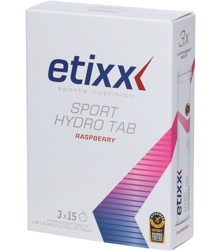 Les compléments alimentaires ne remplacent pas une alimentation équilibrée et variée et un mode de vie sain.etixx SPORT HYDRO TABEtixx Sport Hydro Tab fournit un mélange idéal d'électrolytes qui, en combinaison avec l'eau, aide à rééquilibrer votre balance des fluides. Votre corps transpire pendant l'exercice pour éviter que votre température corporelle ne soit trop élevée.Le liquide perdu doit être reconstitué en buvant. De cette façon, vous maintenez l'équilibre des fluides dans votre corps. Ingrédients : Acide : acide citrique - électrolytes : carbonate de sodium, chlorure de sodium, citrate de sodium, chlorure de potassium, carbonate de calcium, carbonate de magnésium - arôme (lait) - poudre de jus de betterave - inuline - édulcorant : sucralose.Valeurs nutritionnelles : Par comprimé Energie 8 kcal / 34 kJ Graisses dont acides gras saturés 0 g 0 g Protéines 0 g Glucides dont sucres 0,2 g 0,1 g Sels 2,08 g Consommation recommandée : Dissoudre un demi-comprimé effervescent dans 500 ml d'eau et boire.Conseil :Ne pas dépasser la quantité journalière recommandée indiquée.Stockage :Conserver dans un endroit frais (6-25 °C) à l'abri de la lumière. Tenir hors de portée des enfants.Quantité nette : 45 comprimés effervescentsFabricant : Etixx ...