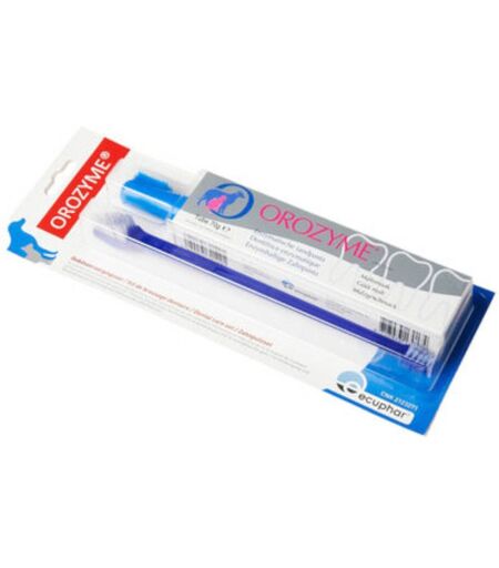 Contient un tube de dentifrice enzymatique OROZYME de 70 g, un doigtier et une brosse à dents.OROZYME dentifrice enzymatique Les produits d’hygiène buccale OROZYME ont été développés spécialement pour combattre la formation de tartre et prévenir ses conséquences.Le dentifice enzymatique OROZYME contient un complexe enzymatique breveté qui prévient la formation de la plaque dentaire, l’accumulation de tartre et la mauvaise haleine. Les abrasifs doux contenus dans la pâte, conjugués à l’action mécanique de la langue et de la salive et la brosse à dents, aident à éviter la formation de la plaque dentaire. Il suffit de mettre le gel dans les poches des joues Répartition dans la cavité buccale par mouvements de la langue Le gel adhère aux dents, la déglutition rapide est empêchée Excellente acceptation en raison du goût de maltIndications OROZYME dentifrice enzymatique Le brossage quotidien avec le dentifrice OROZYME est fortement recommandé. Le goût du malt en facilite le brossage. Le brossage quotidien avec une brosse à dents douce est la méthode la plus efficace pour enlever la plaque dentaire et pour prévenir les infections de la gencive.Conseils d'utilisation Placez vous dans un endroit tranquille, à un moment où votre chien est détendu (p.e. le soir après le repas). Habituer votre chien: pendant quelques jours, contentez vous de masser les joues de votre chien, de lui faire accepter que vous souleviez ses babines, que vous passiez un doigt sur ses gencives. En récompense, faites lui goûter le dentifrice OROZYME. Faire accepter progressivement le brossage de toutes les dents avec le doigtier. Appliquer le dentifrice OROZYME sur le doigtier. Frotter doucement les dents et les gencives à l’avant de la bouche. Petit à petit, lorsque votre chien s’habitue au brossage, passer aux dents du fond de la bouche. Brosser doucement pendent 30 secondes chaque côte de la mâchoire (les dents et les gencives). Le brossage quotidien avec brosse à dents OROZYME est la méthode la plus efficace pour enlever la plaque dentaire. Après chaque séance d’apprentissage récompenser votre chien en lui donnant une lamelle à mâcher OROZYME. Par la suite, lamelle à mâcher OROZYME sera donnée en alternance avec le brossage.Composition OROZYME dentifrice enzymatique Complexe LPO breveté : amylase, glucoamylse, glucose oxydase, lactoperoxydase, superoxyde dismutase (SOD), thiocyanate de potassium, lysozyme, lactoferrine, composants polissants doux, surfactant non ionique, arômesConditionnement dentifrice enzymatique 70 g doigtier x 1 brosse à dents x1 ...