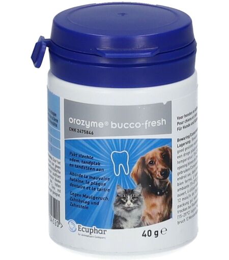 OROZYME Bucco-Fresh ProDen PlaqueOff est un produit patenté et 100% naturel à base d’algues (Ascophylleum nodosum), qui est ajouté à la nourriture quotidienne. Il empêche la plaque dentaire d’adhérer aux dents et ramollit les dépôts de tartre. Indications: OROZYME Bucco-Fresh est une innovation dans la lutte contre la mauvaise haleine chez les chiens et les chats. Il est conseillé de commencer à employer OROZYME après un détartrage chez le vétérinaire ou lorsque le chien n’a pas encore de sérieux problèmes de plaque dentaire. L’idéal est de démarrer l’entretien bucco-dentaire au stade du chiot. Composition: Algues séchées (Ascophyllum nodosum) Constituants analytiques: Protéines brutes : 6 %, graisses brutes : 3 %, cendres brutes : 22 % ; iode : 0,08 %. Conseils d'utilisation: Administrer une fois par jour sous la nourriture. Poids Nombre de cuillères < 10 kg 1/2 - 1 10-25 kg 1-2 > 25 kg 2-3 OROZYME® BUCCO-FRESH Poudre peut être utilisé en continu. Durée d'utilisation: Chien < 10 kg et chats : 4 - 8 mois Chien de 10 à 25 kg : 2 à 4 mois Chien > 25 kg : 1,5 - 2 mois Précautions d’emploi: Ne pas donner aux animaux souffrant d'hyperthyroïdie. Conservation: Conserver dans un emballage bien fermé dans un endroit sec à température ambiante (15-25°C). Conditionnement: Pot de 40 g ...