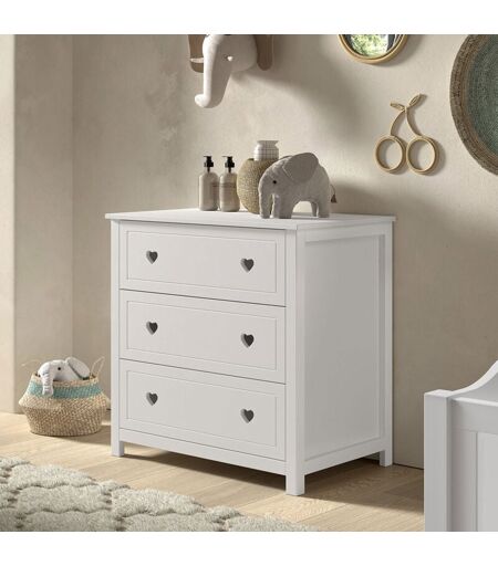 Cette Commode 3 tiroirs en pin blanc AMORENA sera parfaite pour meubler une chambre d'enfant ou d'un nouveau-né. Elle comporte trois tiroirs juxtaposés et étalés sur toute la largeur du mobilier. Avec les fentes en forme de cœur sur chaque compartiment, cet article de rangement propose un style original doublé d'un aspect pratique. Sa fabrication en panneaux de particules et en pin massif laqué est tout à fait résistante pour contenir les jouets et les articles usuels du bébé. Le blanc sur cette commode s'harmonise à merveille avec les couleurs douces ou vives dans la pièce. Couleur : blanc Matière : panneaux de particules et pin massif laqué Dimensions hors tout (Lxlxh) : 90 x 57 x 89 cm Dimensions intérieures des tiroirs (Lxlxh) : 74 x 42,5 x 16,5 cm Hauteur des pieds : 6 cm Poids maximal supporté : 110 kg Poids : 49,3 kg Livrée prête à monter ...