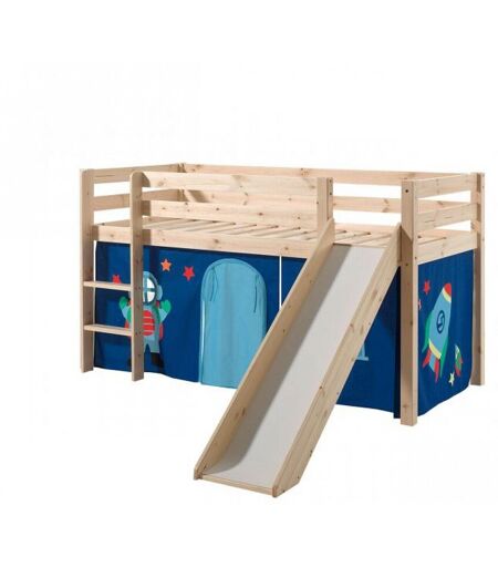 Lit mezzanine 90 x 200. Toboggan. Laque UV. EN747-1&2. Garantie : 1 an(s). Mati?re : Pin Massif. Couleur : Nature. Livr? sans matelas ni linge de lit ni accessoires Description du produit: Pino lit mezzanine avec toboggan 90 x 200 en pin massif, coloris bois naturel. L'enfant peut descendre le lit en utilisant le toboggan ou l'?chelle. Lit est prot?g? par le laque UV afin d'?viter la d?coloration du pin. Conforme aux normes EN747-1&2. Produit en 100% pin massif.. Dimensions: 209 x 217 x 114 cm. Nombre de parts: 1 Personne(s). Le sommier est inclus. Rideau de lit: Transformez le lit mi-hauteur Pino de votre petit astronaute en v?ritable vaisseau spatial o? jouer ou pour se r?fugier en lui ajoutant ce joli rideau au bas de son lit ! Dimension L x Lg x H L 23.5 x Lg 0.5 x H 14 cm Couleur : bleu 100% COTON ...