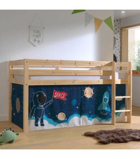 Donnez à votre enfant la possibilité de voyager sans quitter sa chambre en lui offrant ce lit surélevé avec échelle naturel décor astronaute issu de la gamme PINO. Le départ pour le pays des rêves se fera depuis son confortable couchage avec sommier inclus , après avoir utilisé l'échelle montée à droite ou à gauche . Une fois revenu sur terre, c'est derrière les superbes rideaux en coton qu'il profitera d' un bel espace au sol pour s'amuser . Vous serez conquis par la conception en pin , synonyme de robustesse et de solidité pendant de longues années. Couleur : naturel finition laquée Matière : pin et rideau 100% coton Sommier inclus, matelas non inclus Couchage : 90 x 200 cm Dimensions (Lxlxh) : 209,50 x 105,40 x 114 cm Section des pieds (Lxl) : 6,50 x 6,50 cm Hauteur entre le sol et le bas du lit : 72,5 cm Hauteur maximum recommandée pour le matelas : 18 cm L'échelle peut être montée à droite ou à gauche Poids maximum supporté : 75 kg / Age minimum : 6 ans Certifié FSC® Poids : ...