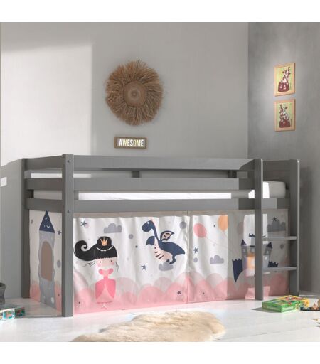 Laissez entrer un monde merveilleux dans la chambre de votre enfant en optant pour ce lit surélevé avec échelle gris au décor magique rose de la gamme PINO. Grâce aux motifs qui habillent les rideaux en coton et leurs jolies couleurs claires , il créera dans la pièce une ambiance fantastique propice à l'amusement. Cette sensation sera accentuée par la possibilité d'installer des rangements pour les nombreuses poupées et autres peluches licornes dans la surface disponible sous le sommier inclus . Ce modèle ainsi que son échelle positionnable à droite ou à gauche sont fabriqués en pin , ce qui les rend hautement résistants . Ce modèle de lit sera livré chez vous prêt à monter. Couleur : gris finition laquée Matière : pin et rideau 100% coton Sommier inclus, matelas non inclus Couchage : 90 x 200 cm Dimensions (Lxlxh) : 209,50 x 105,40 x 114 cm Section des pieds (Lxl) : 6,50 x 6,50 cm Hauteur entre le sol et le bas du lit : 72,5 cm Hauteur maximum recommandée pour le matelas : 18 cm ...