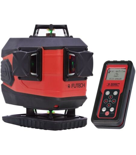 Laser Croix-lignes 4D - Précision 1mm/10m - Portée 2x 60m. - Nivellement électronique - Équipé d’une télécommande interactive - Deuxième ligne horizontale en dessous de l’appareil, 20mm au-dessus du sol - Accu Lithium-Ion. Classe de laser Class 2 - 515NM - ...