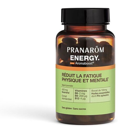 Complément alimentaire à utiliser dans le cadre d’une alimentation variée, équilibrée et d’un mode de vie sain.Pranarom Aromaboost ENERGYConçu pour aider à réduire la fatigue physique et mentale(1), le complément alimentaire Aromaboost ENERGY offre un soutien durable pour maintenir votre énergie tout au long de la journée(1). Idéal dans les périodes de fatigue intense ou pour surmonter une baisse de régime(1), ce complément alimentaire sans risque de dépendance offre soutient votre énergie sur le long terme(1), avec une cure recommandée de 1 mois. Aromaboost ENERGY a fait l'objet d'un test consommateur : Près de 9 personnes sur 10 ressentent un effet anti-fatigue 90% des personnes constatent un maintien des effets dans le temps Près de 9 personnes sur 10 constatent un effet rapide Effet ressenti dès le 3ème jour Les capsules Aromaboost ENERGY tirent leur puissance de l’extrait sec de Guarana et des vitamines B6, B9 et B12. La formule est boostée par une synergie experte d’Huiles Essentielles de Pin Sylvestre, Cannelle de Chine et Menthe poivrée. Le complément alimentaire Aromaboost ENERGY présente une composition à 99,6% d'ingrédients d'origine naturelle, sans sucre et sans gluten. (1)Extrait sec de Guarana : le Guarana, reconnu pour ses vertus tonifiantes, aide à maintenir la vitalité physique et mentale. (1)Vitamines B6, B9 et B12 : ces vitamines essentielles contribuent à réduire la fatigue et favorisent un métabolisme énergétique normal, vous permettant de rester actif et alerte. 2 capsules par jour de la cure Aromaboost ENERGY couvrent au moins 100% des besoins quotidiens en vitamines. Huiles Essentielles 100% naturelles, pures et intégrales : la formule Aromaboost Energy est enrichie de trois Huiles Essentielles soigneusement sélectionnées pour leurs propriétés stimulantes et tonifiantes : Huile Essentielle de Pin sylvestre : traditionnellement utilisée comme tonique, elle stimule et revigore votre corps et votre esprit*. Huile Essentielle de Cannelle de Chine : reconnue pour ses effets stimulants, elle renforce la résistance contre la fatigue physique et mentale, vous permettant de rester performant*. Huile Essentielle de Menthe poivrée : appréciée pour ses bienfaits sur le bien-être physique, ses propriétés stimulantes garantissent une énergie durable*. *Allégations de santé en attente d'approbation par l'EFSA. Complétez votre rituel alimentaire Roll-on ENERGY : Un geste simple et instantané pour un regain d'énergie, à emporter partout avec soi. Brume dynamisante ENERGY : Une solution à vaporiser au quotidien ou en cas de besoin, aux fragrances stimulantes pour créer une ambiance énergisante. *Test consommateur réalisé par un institut indépendant sur 50 personnes pendant 30 jours.IngrédientsPour 2 capsules : Huile végétale de tournesol (Helianthus annuus); Extrait standardisé de Guarana (Paullinia cupana extract - 400 mg, dont 40 mg Caféine); Gélatine; Gélifiant : Sorbitol; Emulsifiant : lecithine de tournesol ; Humectant : Glycérol;... ...