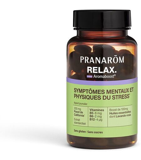 Complément alimentaire à utiliser dans le cadre d’une alimentation variée, équilibrée et d’un mode de vie sain.Pranarom Aromaboost RELAXConçu pour aider à la gestion des stress passagers*, le complément alimentaire Aromaboost RELAX offre une solution durable pour soutenir les signes mentaux et physiques du stress*. Idéal durant les périodes de tension nerveuse intense ou pour surmonter une anxiété passagère, ce complément alimentaire sans risque de dépendance offre une meilleure gestion du stress passager sur le long terme*, avec une cure recommandée de 1 mois. Aromaboost RELAX a été testé lors d’une étude en vie réelle* : -Réduction du stress ressentie par 92% des personnes -Effet ressenti, dans les 4 premiers jours, par près de 9 personnes sur 10 -92% des personnes constatent les bienfaits sur leur niveau de stress Les capsules Aromaboost RELAX tirent leurs vertus de l’extrait sec de Pavot de Californie et des vitamines B5, B6 et B12. La formule est boostée par une synergie experte d’Huiles Essentielles de Lavande vraie, Menthe verte et Ravintsara. Le complément alimentaire Aromaboost RELAX présente une composition à 99,2% d'ingrédients d'origine naturelle, sans sucre et sans gluten. Composition détaillée : *Extrait sec concentré de Pavot de Californie : le pavot de Californie est indiqué pour le soulagement de symptômes légers liés au stress mental. Allégation de santé en attente d'approbation par l'EFSA. *Vitamines B5, B6 et B12 : contribuent au fonctionnement normal du système nerveux. 2 capsules par jour de la cure Aromaboost RELAX couvrent au moins 100% des besoins quotidiens en vitamines. Huiles Essentielles 100% naturelles, pures et intégrales : la formule Aromaboost RELAX est enrichie d’Huiles Essentielles de Lavande vraie, Menthe verte et Ravintsara, soigneusement sélectionnées pour diminuer la tension nerveuse et contribuer à une relaxation optimale. Complétez votre rituel alimentaire avec le Roll-on RELAX, un geste simple et instantané pour retrouver calme et apaisement, à emporter partout avec soi. *Test consommateur réalisé par un institut indépendant sur 50 personnes pendant 30 jours.IngrédientsPour 2 capsules : Huile végétale de tournesol (Helianthus annuus); Gélatine; Extrait standardisé de Pavot de Californie (Eschscholzia californica extract - 200 mg); Gélifiant : Sorbitol; Emulsifiant : Cire d’abeille (Cera alba) ; Huile essentielle de Lavande vraie (Lavandula angustifolia - 70 mg); Humectant : Glycérol ; Aqua; Emulsifiant : lecithine de tournesol; Gélifiant : pectine; Huile essentielle de Menthe verte (Mentha spicata - 20 mg); Huile essentielle de Ravintsara (Cinnamomum camphora CT cineole - 10 mg); Vitamine B5 (Acide pantothénique) 7,18 mg (equiv. 6 mg vit. B5 (100% AJR)); Vitamine B12 (Methylcobalamine) 4,76 mg (Equiv. 4 µg vit. B12 (160% AJR)); Vitamine B6 (Pyridoxine) 2,68 mg (equiv 2 mg vit. B6 (142% AJR)); Anti-oxydant : mélange de tocophérols. Sucres inférieurs à 0,5%.Conseils d'utilisationÀ partir de 18 ans : 2... ...