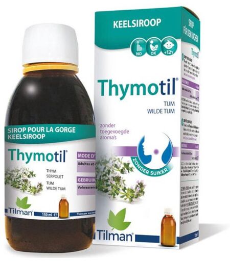 Complément alimentaire à utiliser dans le cadre d'une alimentation variée, équilibrée et d'un mode de vie sain.Depuis l’Antiquité, le thym est utilisé pour son action apaisante de la gorge. Cette plante aromatique typique des régions méditerranéennes possède des propriétés assainissantes précieuses dans les irritations de la gorge et les enrouements. Un peu moins connu que son cousin le thym commun, le serpolet se développe spontanément à l'état sauvage. Sa composition et ses caractéristiques sont fort proches de celles du thym.BénéficesAdoucissant pour la gorge tout en étant savoureux, il apaise et dégage les gorges irritées et calme les enrouements de courte durée.Conseils d'utilisationEnfants de 3 à 6 ans : 5 ml, 1 cuillerée à café, 4x/jourEnfants de 7 à 11 ans : 10 ml, 2 cuillerées à café, 4x/jourAdultes et enfants à partir de 12 ans : 15 ml, 1 cuillerée à soupe, 4x/jourThymotil® ne contient pas de sucre et convient donc aux diabétiques.CompositionIngrédients par 60 ml : Edulcorant : sirop de maltitol, Eau, Stabilisant : glycérol, Ethanol (alc. 9% vol), Extrait fluide de thym (Thymus vulgaris) 3,9 g, Extrait fluide de serpolet (Thymus serpyllum) 3,3 g.Valeur nutritionnelle Par 60 mlExtrait fluide de thym (Thymus vulgaris)3,9 gExtrait fluide de serpolet (Thymus serpyllum)3,3 gPrécautions d'emploiNe pas dépasser la dose journalière recommandée. Tenir hors de portée des enfants. Thymotil® ne contient pas de sucre et convient donc aux diabétiques. Ne pas utiliser durant les 3 premiers mois de grossesse.Poids net150 mlFabricant TILMAN SAZ.I. Sud 15B-5377 BaillonvilleBelgique ...