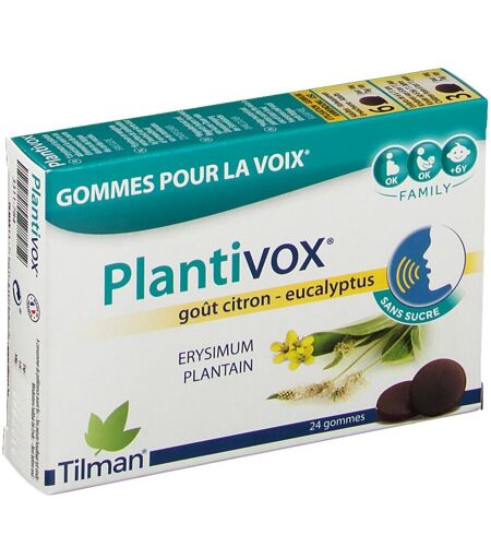 Il est important d'avoir une alimentation variée et équilibrée et un mode de vie sain.Plantivox associe les bienfaits de l’érysimum et du plantain dans une gomme à sucer pour la voix au délicieux goût de citron et d’eucalyptusL’érysimum et le plantain adoucissent la voix en cas d’enrouements ou de fatigue des cordes vocales.L’érysimum est la plante de prédilection des orateurs, des comédiens et des chanteurs, qui l’utilisent pour éclaircir leur voix en cas d’enrouements ou de fatigue des cordes vocales.Les feuilles de plantain sont utilisées depuis des siècles pour adoucir la gorge et, également, pour calmer les voies respiratoires.Composition:Agent de charge : gomme arabique - Edulcorants : sirop de sorbitol, sirop de maltitol - Extrait sec de plantain (Plantago lanceolata) 30 mg - Extrait sec d’érysimum (Sisymbrium officinale) 20 mg - Arômes naturels - Edulcorants : sucralose, glycosides de stéviol - Huile de coco - Agent d'enrobage : cire de carnauba.Peut contenir des traces d'œuf, de fruits à coques et de blé.Valeur nutritionnelle: Par gommeExtrait sec de plantain30 mgExtrait sec d’érysimum20 mgConseil d'utilisation:Enfants de 6 à 11 ans : 3 pastilles/jour.Adultes et enfants à partir de 12 ans : 6 pastilles/jour.Précautions d'emploi:Tenir hors de portée des jeunes enfants.Ne pas dépasser la dose journalière conseillée.Une consommation excessive peut avoir des effets laxatifs.Poids net:24 gommesFabricant:TilmanZI Sud 155377 Belgien ...