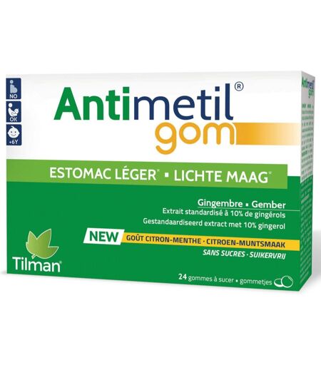 Complément alimentaire à utiliser dans le cadre d'une alimentation variée, équilibrée et d'un mode de vie sain.Gardez l’estomac léger ! *Pour se sentir mieux rapidement !Grâce à sa formule naturelle à base de gingembre, Antimetil gom est parfaitement adapté pour vous aider à retrouver un équilibre digestif optimal* dans les situations suivantes : en cas d’excès alimentaires ou de régime alimentaire inhabituel (en vacances par exemple), lors de déplacements agités ou de stress trop important.Antimetil gom se présente sous forme de gommes sans sucre au délicieux goût de citron-menthe. Ne nécessitant pas d’eau, Antimetil gom est idéal à emporter partout ! Chaque gomme contient 25 mg d’extrait de gingembre. L’extrait de gingembre utilisé est 10 x plus concentré qu’une poudre de gingembre traditionnelle.Petit conseil avant de partir en vacances : n’oubliez pas d’inclure Antimetil gom dans votre pharmacie de voyage.IngrédientsIngrédients par gomme : Édulcorants : sirop de maltitol, sirop de sorbitol ,Agent de charge : gomme arabique ,Gélatine bovine ,Stabilisant : bêta-cyclodextrine ,Extrait sec de gingembre standardisé** (Zingiber officinale) 25 mg ,Arômes naturels ,Antioxydant : acide ascorbique ,Édulcorants : glycosides de stéviol, sucralose ,Huile de coco.**10% de gingérols : 25 mg d’extrait standardisé équivalent à 250 mg de poudre de gingembre.Conseils d'utilisations24 gommesPrécautions d'emploiEn cas de voyage ou déplacement, prendre les gommes 30 minutes avant le départ.Ne pas utiliser pendant la grossesse.Tenir hors de portée des jeunes enfants.Ne pas dépasser la dose journalière conseillée.Ne peut être utilisé comme substitut d’une alimentation variée et équilibrée et d’un mode de vie sain.Une consommation excessive peut avoir des effets laxatifs.Poids net24 gommesFabricantTilman S.AZ.I Sud 15B-5377 Baillonville ...