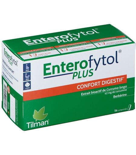 Complément alimentaire à utiliser dans le cadre d’une alimentation variée, équilibrée et d’un mode de vie sain.À base de berbérine et d’extrait de curcuma bioactif, Enterofytol® PLUS est recommandé en cas d’inconfort digestif.La curcumine, présente en quantité importante dans l’extrait sec de curcuma, contribue au confort digestif. L’extrait bioactif de curcuma a été développé pour rendre la curcumine assimilable par l’organisme et garantir un effet optimal.La berbérine, quant à elle, a la capacité de moduler la composition du microbiote intestinal.Composition:Agent de charge : cellulose microcristalline • Extrait sec de berbérine (Berberis aristata) 200 mg • Agents de charge : phosphate dicalcique, copolymère méthacrylate basique • Extrait sec de curcuma (Curcuma longa) 46,7 mg (dont 42 mg de curcumine) • Anti-agglomérants : dioxyde de silicium, sels de magnésium d’acides gras, talc • Agents d’enrobage : hydroxypropyl cellulose, hydroxypropyl méthylcellulose • Colorant : oxydes et hydroxydes de fer.Valeur nutritionnelle: Pour 1 compriméCurcuma (Curcuma longa)46,7 mgExtrait bioactif standardisé de curcumine42 mgBerbérine 200 mgConseil d'utilisation:Adultes et enfants à partir de 12 ans: 1 comprimé matin et soir, pendant le repas.Précautions d'emploi:Ne pas dépasser la dose journalière indiquée. À tenir hors de portée des enfants. À conserver dans un endroit frais et sec.Ne pas utiliser en période de grossesse ou d’allaitement, ni en cas d’obstruction des voies biliaires. Consultez votre médecin ou votre pharmacien en cas d’usage concomitant d’anticoagulants.Poids net:56 comprimés Fabricant:TilmanZI Sud 155377 Belgique ...