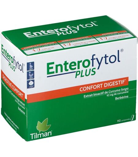 Complément alimentaire à utiliser dans le cadre d’une alimentation variée, équilibrée et d’un mode de vie sain.Enterofytol® PLUS est une innovation du laboratoire Tilman. Il vous permet de bénéficier de la berbérine et du meilleur de l’extrait de Curcuma longa pour vous procurer un effet optimal et ainsi soutenir votre confort digestif* :L’extrait exclusif standardisé de Curcuma longa contient de la curcumine, un puissant antioxydant qui contribue au confort digestif*. La berbérine, quant à elle, a prouvé son intérêt scientifiquement pour renforcer les effets du curcuma. Cette association a été spécialement choisie par Tilman grâce aux nombreuses études scientifiques qui démontrent les bienfaits de ces actifs.* La curcumine possède des propriétés antioxydantes et contribue au confort digestif. Allégations de santé en attente d’approbation par l’EFSA.IngrédientsPar comprimé : agent de charge : cellulose microcristalline, berbérine 200 mg, agents de charge : phosphate dicalcique, copolymère méthacrylate basique, extrait sec standardisé de rhizome de curcuma (Curcuma longa) 49 mg dont 42 mg de curcumine, anti-agglomérants : dioxyde de silicium, sels de magnésium d’acides gras, talc, agents d’enrobage : hydroxypropylcellulose, hydroxypropylméthylcellulose, colorant : oxydes et hydroxydes de fer.Ingrédients actifsComprimés à base d'extrait exclusif de curcuma (Curcuma longa) standardisé à 42 mg de curcumine et de berbérine 200 mg.Conseils d'utilisationAdultes et enfants dès 12 ans : 1 comprimé matin et soir, pendant le repas.Utilisation conseillée de minimum 2 mois.Précautions d'emploiConserver dans un endroit frais et sec.Tenir hors de portée des jeunes enfants.Ne pas dépasser la dose recommandée.Enterofytol Plus® ne peut être utilisé en-dessous de 12 ans.Ne doit pas être utilisé en cas de grossesse ou d’allaitement, ni en cas d’obstruction des voies biliaires.Consultez votre médecin ou notre service pharmaceutique en cas de prise concomitante d'anticoagulants et de curcuma.Poids net112 comprimésAdresse du FabricantTilman15, Zl Sud5377 BaillonvilleBelgique ...