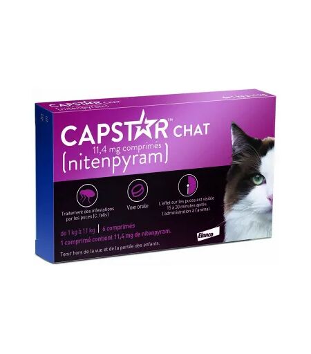 Capstar Chat est un médicament antiparasitaire pour les chats. Il est indiqué dans le traitement des infestations par les puces. Les animaux de compagnie sont nos meilleurs amis, mais sont aussi fragiles. Les puces et tiques sont des nuisibles qui viennent se nicher sur vos animaux de compagnie lors des promenades. Ce petit insecte se multiplie très rapidement, vient coloniser son habitat (panier, coussin…) et provoque des démangeaisons. Pour lutter et éradiquer les puces de votre chat, Capstar du laboratoire Elanco, sous forme de comprimés, est un traitement anti-puces destiné au chat de 1 à 11 kg. Il contient du nitempyram, une molécule redoutable qui tue les puces présentes sur le corps de l’animal. En effet, le nitempyram est un principe actif qui interrompt la conduction nerveuse chez la puce adulte. Les comprimés Capstar Chat sont à utiliser lorsque le chat est infesté de puces. Ce traitement ne va traiter que l'animal, il sera nécessaire de traiter votre habitation, afin que votre chat ne se réinfeste pas. Capstar Chat s'utilise chez les chats à partir d'un mois et pesant plus de 1 kg. La posologie est d'un comprimé, à donner pour éliminer les puces. Selon la gravité de l'infestation, il est possible de renouveler le traitement plusieurs jours, jusqu'à élimination complète des puces. Il ne faut pas dépasser 1 comprimé par jour. Il est possible de cacher le comprimé dans de la nourriture si votre chat refuse de prendre le comprimé. Après administration, il est possible que votre chat se lèche, miaule et se démange plus que d'habitude. Ces effets indésirables sont temporaires. Les comprimés Capstar peuvent être administrés chez la chatte gestante ou allaitante. Le médicament Capstar Chat est composé de Nitenpyram. Les excipients également présents dans ce médicament sont la cellulose microcristalline, l'amidon de maïs, le lactose monohydraté, la silice anhydre et le stéarate de magnésium. Capstar chat est un traitement curatif qui permet de traiter votre animal de compagnie contre les infestations par les puces pour les chats. Pratique et facile d’utilisation, l'administration de ce traitement antiparasitaire ne nécessite pas l'isolement de votre animal. Il suffit de donner un comprimé à votre chat par voie orale et celui-ci agit entre 15 à 30 minutes et 6 heures après administration et absorption du comprimé, 100% des puces sont tuées. Les comprimés Capstar pour chat ne protègent pas votre animal d’une ré-infestation. Il ne sont pas non plus à utiliser en prévention. Il est nécessaire d’utiliser un traitement anti-puces en prévention (spot-on, comprimés, spray…). En complément du traitement de l'animal, il est important de traiter votre habitation afin que votre animal ne se réinfeste pas. Nous vous conseillons l'utilisations de sprays et foggers anti puces. Comme au comptoir, posez vos questions à nos pharmaciens sur Capstar Chat. Le comprimé Capstar Chat peut être administré dès que des puces ont été vues sur le pelage du... ...