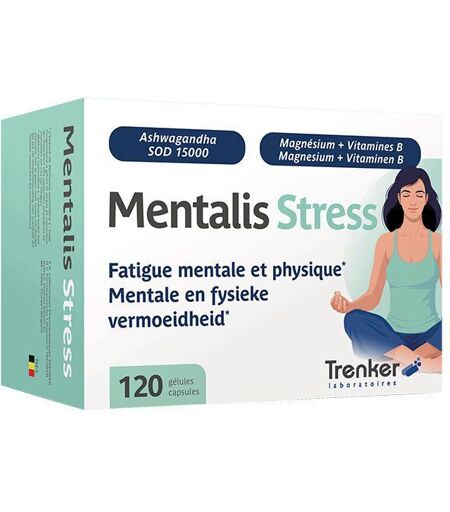 Complément alimentaire à utiliser dans le cadre d’une alimentation variée, équilibrée, d’un mode de vie sain.POUR AIDER LE CORPS À RÉSISTER AU STRESS*Notre mode de vie moderne peut induire de nombreuses situations génératrices de stress et de fatigue. Parmi celles-ci, l’investissement professionnel est souvent considéré comme l’une des causes principales de lassitude aussi bien mentale que physique. Ainsi, dans les pays développés, on estime que près d’un tiers de la population ressentira un jour ou l’autre les effets du stress ou de la fatigue.Propriétés:L’Ashwagandha (Withania somnifera L.) est communément connue en tant que ginseng indien. Cette plante est traditionnellement utilisée en Inde depuis des siècles pour ses bienfaits multiples. Parmi ceux-ci, le rôle de l’Ashwagandha dans la relaxation optimale et le maintien de l’énergie a fait l’objet d’études récentes.L’oxygène est indispensable au bon fonctionnement des cellules. Cependant, son utilisation dans la production d’énergie entraîne également la génération de radicaux libres. Ces molécules sont neutralisées par les antioxydants. Certains facteurs tels que la pollution, le tabagisme, les rayons solaires et le stress peuvent altérer le fonctionnement de ce système de protection : c’est ce que l’on appelle le stress oxydatif.Pyramizym® est un complexe enzymatique breveté extrait d’une variété de melon (Cucumis melo L.) spécialement sélectionnée pour sa haute teneur en antioxydants. Mentalis stress contient un magnésium de dernière génération alliant une bonne concentration en magnésium, une biodisponibilité exceptionnelle et une excellente tolérance. De plus, Mentalis stress allie l’efficacité du magnésium liposomial à l’ensemble des vitamines B sous une forme naturelle. Ils vont agir en synergie pour une action plus complète72% de stress en moins !**Bénéfice:Pyramizym® est une exclusivité des Laboratoires Pharmaceutiques Trenker. Il contient de hauts dosages des trois enzymes: la Superoxyde Dismutase, la Catalase et la Glutathion Peroxydase. Composition: Par gélule: 300 mg d’extrait d’ashwagandha (Withania somnifera L., KSM-66). Gélule : hypromellose. 100 mg de Saccharomyces cerevisiae 100% inactivée. 75 mg de magnésium (oxyde de magnésium, 20% AR).Supports : amidon prégélatinisé de riz, sucroesters d’acides gras, lécithines de tournesol. 8 mg de vitamine B3 (nicotinamide, 50% AR). 5 mg de superoxyde dismutase (SOD 15000 UI/g) de melon (Cucumis melo L.). Agent de charge : amidon de maïs. 3 mg de vitamine B5 (D-pantothénate de calcium, 50% AR). Antiagglomérant : silice colloïdale. 0,7 mg de vitamine B6 (chlorhydrate de pyridoxine, 50% AR), 0,7 mg de vitamine B2 (riboflavine, 50% AR), 0,55 mg de vitamine B1 (chlorhydrate de thiamine, 50% AR). Agent de charge : amidon prégélatinisé. 100 μg de vitamine B9 (acide folique, 50% AR), 25 μg de vitamine B8 (D-biotine, 50% AR),1,25 μg de vitamine B12 (cyanocobalamine, 50% AR)Valeur nutritionelle: Pour 1 gélule *AJR Extrait d'Ashwagandha 300 mg... ...
