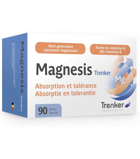 Complément alimentaire à utiliser dans le cadre d'une alimentation variée, équilibrée et d'un mode de vie sain.Le magnésium est un minéral indispensable au bon fonctionnement de l’organisme. Il est impliqué dans de nombreuses fonctions vitales comme le bon fonctionnement des muscles et des nerfs. Nous ne pouvons produire le magnésium dont nous avons besoin, c’est pourquoi un apport via l’alimentation est indispensable. Certaines situations comme la grossesse, l’activité sportive ou les situations de stress peuvent engendrer des besoins accrus en magnésium.Le magnésium contribue à réduire la fatigue, au fonctionnement du système nerveux (transmission nerveuse), au maintien d’une ossature saine, à une fonction musculaire normale (contraction musculaire). La vitamine B5 contribue à retrouver des performances intellectuelles normales. La vitamine B5 joue un rôle dans toutes les cellules incluant le cerveau et les cellules nerveuses. La vitamine B9 contribue à la croissance des tissus maternels durant la grossesse. 4 La vitamine B6 contribue au fonctionnement du système immunitaire.Composition:magnésium. Gélule : hypromellose. 200 mg de Saccharomyces cerevisiae 100% inactivée. Agent de charge : cellulose microcristalline, Support : amidon prégélatinisé de riz, sucroesters d’acides gras, lécithines de tournesol. 16 mg de vitamine B3, Antiagglomérants : stéarate de magnésium, dioxyde de silice, vitamine B5, vitamine B6, vitamine B2, vitamine B1, vitamine B9, vitamine B8, vitamine B12.Valeurs nutritionnelles: Pour 2 gélules% AJR*Magnésium300 mg80 %Saccharomyces cerevisiae200 mg Vitamine B316 mg100 %Vitamine B56 mg100 %Vitamine B61,4 mg100 %Vitamine B21,4 mg100 %Vitamine B11,1 mg100 %Vitamine B9200 µg100 %Vitamine B850 µg100 %Vitamine B122,5 µg100 %*Apport journalier de référenceConseil d'utilisation:1 à 2 gélules par jour, à prendre avec un verre d’eau.Précautions d'emploi:Ne pas dépasser la dose journalière recommandée. Tenir hors de portée des enfants, dans un endroit sec à température ambiante, à l'abri de la lumière directe du soleil. Magnesis Trenker ne devrait pas être pris, sans consulter un médecin, par les personnes souffrant de maladies rénales.Poids net:70 g = 90 gélulesFabricant:TrenkerAvenue Thomas Edison, 321402 Thines (Nivelles)Belgique ...