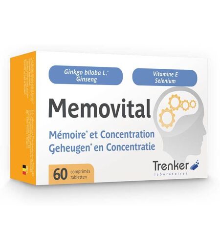Complément alimentaire à utiliser dans le cadre d’une alimentation variée, équilibrée et d’un mode de vie sain.Nos modes de vie actuels sollicitent davantage notre attention, notre concentration et font sans cesse appel à notre mémoire.Dès l’âge adulte, nous pouvons ressentir le besoin d’un aide-mémoire. Le Ginkgo biloba, considéré comme l’un des plus vieux arbres du monde, semble avoir traversé les siècles depuis plus de 270 millions d’années. Intégré en Europe dans les années 60 par Engelbert Kaempfer, il est dès lors reconnu pour ses multiples bienfaits, notamment au niveau du bien-être mental.La racine de Panax ginseng, largement consommée en Asie depuis des milliers d’années, doit être cultivée au moins 6 ans pour arriver à maturité. La plante acquiert alors tous ses principes actifs de qualité, entres autres ceux qui sont associés à la vitalité physique et intellectuelle.Memovital contient des extraits de Ginkgo biloba et de Panax ginseng standardisés et hautement concentrés en principes actifs.IngrédientsAgent de charge: hydrogénophosphate de calcium ; 100 mg d’extrait sec de ginseng (Panax ginseng C.A. Meyer) contenant 10 mg de ginsénosides ; Agent de charge : amidon prégélatinisé ; 60 mg d’extrait sec de Ginkgo biloba L. contenant 14,4 mg de glycosides de flavonol et 3,6 mg de lactones terpéniques ; Agent de charge : hydroxypropylcellulose ; Agents d’enrobage: hypromellose, lactose ; Colorant: (E171) ; Agent d’enrobage : polyéthylène glycol ; Colorant : oxyde de fer jaune (E172) ; 35 µg de sélénium (levures enrichies en sélénium, 63,6% AR) ; 5 mg de vitamine E (hydrogénosuccinate de D-a-tocophéryle, 41,7% AR) ; Antiagglomérant: stéarate de magnésium, silice colloïdale ; Agent d’enrobage : cire de carnauba.Valeurs nutritionnelles Pour 1 comprimé %AJR* Extrait de Panax ginseng 100 mg Extrait de Ginkgo biloba L. 60 mg Selenium 35 µg 63,6 % Vitamine E 5 mg 41,7 % *apport journalier de référencesConseils d'utilisation1 comprimé par jour.Précautions d'emploiTenir hors de portée des jeunes enfants. Conserver au frais et au sec.Poids net54 g = 60 comprimésAdresse du FabricantTrenkerAvenue Thomas Edison, 321402 Thines (Nivelles)Belgique ...