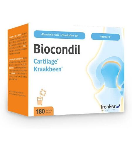 Complément alimentaire à utiliser dans le cadre d’une alimentation variée, équilibrée et d’un mode de vie sain.BiocondilLe cartilage est un tissu conjonctif souple et élastique présent au niveau des articulations. Ses propriétés mécaniques particulières permettent d’absorber les chocs. Avec le temps, l’usure du cartilage peut entraîner des problèmes articulaires et une sensation de gêne au niveau des articulations, ce qui peut entraver la mobilité. Biocondil contient de la glucosamine, de la chondroïtine et de la vitamine C. Cette dernière contribue à la formation normale de collagène et participe ainsi à la fonction normale des cartilages. Biocondil est composé de chlorhydrate de D-glucosamine, un produit très pur (> 99 %) et très stable. Il ne contient pas de sel ajouté (NaCl ou KCl) et contient une haute teneur en glucosamine.Le + Trenker :Biocondil est hautement dosé et contient la source de glucosamine la plus concentrée (1250 mg de glucosamine) associée à la chondroïtine.IngrédientsComposition par dose* (2 comprimés ou 1 sachet)1500 mg de D-glucosamine HCl (1250 mg de glucosamine)1200 mg de sulfate de chondroïtine40 mg de vitamine C (50% AR)* Dose journalière maximum recommandée.Conseils d'utilisation Comprimés : Prise journalière : 2 comprimés à prendre en une fois avec un verre d’eau, de préférence pendant le repas principal. Sachets : Prise journalière : 1 sachet. Dissoudre le contenu d’un sachet dans un verre d’eau (ou de jus d’orange ou de lait, ...).Précautions d'emploi Conserver au frais et au sec. Ne pas dépasser la dose recommandée. Tenir en dehors de portée des jeunes enfants. Les femmes enceintes et allaitantes ne devraient pas prendre de compléments alimentaires sans consulter leur médecin.Poids net180 sachetsFabricantTrenkerAv Thomas Edison 32, 1402 NivellesBelgique ...