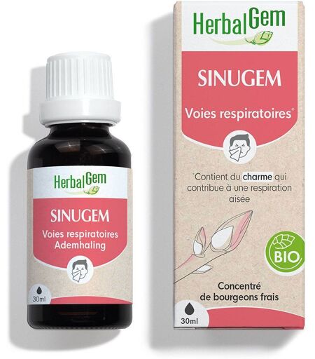 Complément alimentaire à utiliser dans le cadre d’une alimentation variée, équilibrée et d’un mode de vie sain.Complexe voies respiratoires - Respirez plus librement par le nezNez bouché ou qui coule, ponctuellement ou de façon chronique, SINUGEM rend la respiration par le nez plus aisée. L’aulne glutineux agit comme un bouclier en cas d'attaques extérieures, le rosier sauvage aide à renforcer les défenses naturelles grâce à son pouvoir antioxydant et le charme est traditionnellement utilisé pour son action nettoyante.Composition:Bourgeons de charme, d'aulne, de rosier et de cassis.**Ingrédient issu de l’agriculture biologique (contrôle Certisys BE-BIO-01) - BIO signifie : issu de l’agriculture biologique (contrôle Certisys BE-BIO-01).Conseil d'utilisation:Adulte : 5 gouttes 3 fois par jour. Enfant : 1 goutte par année d'âge.Précautions d'emploi: Tenir hors de portée des jeunes enfants. Conserver au frais et au sec. Poids net: 30 mlFabricant: HerbalGem S.A. Place des Chasseurs Ardennais6690 Vielsalm ...