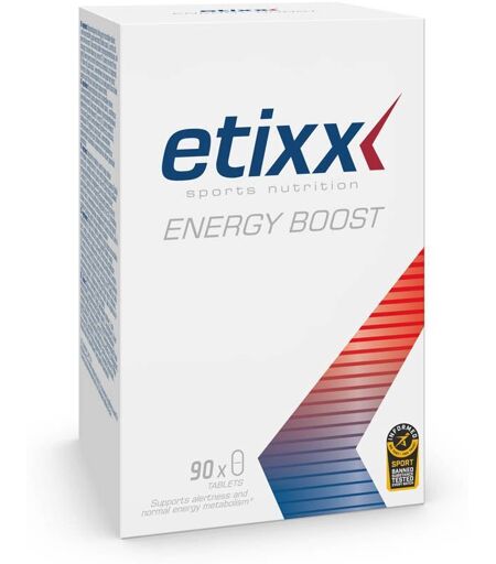 Complément alimentaire à utiliser dans le cadre d'une alimentation variée, équilibrée et d'un mode de vie sain.En périodes d’entraînement lourd ou de compétition, il est important que les sportifs soient en mesure de réaliser de hautes performances sur une plus longue durée. Le corps des sportifs amateurs comme celui des sportifs de compétition est soumis à des contraintes importantes. Energy Boost s’adresse aux personnes confrontées à la fatigue, l’épuisement et au manque d’énergie, sans aucune raison médicale apparente.Les vitamines et les minéraux participent à toute une série de réactions chimiques fondamentales. Ils jouent un rôle fondamental dans le métabolisme énergétique ; comme cofacteurs au cours des processus de production biochimique d’énergie dans les mitochondries (les centres d’énergie cellulaires).Energy Boost est un complément alimentaire qui soutient tant les performances physiques que mentales et qui peut être considéré comme un tonique (plus ou moins comme un agent participant à l’efficacité et qui soutient l’organisme). Il participe par exemple à la vigilance et à la concentration1, soutient l’énergie2 et contribue à réduire la fatigue3. Il comprend une multitude de vitamines (vit. B2, vitamine C, acide folique), minéraux (magnésium, zinc, sélénium) et contient aussi de la lysine (acide aminé), la coenzyme Q10, du guarana, du ginseng, de l’extrait de poivre noir, de l’extrait de café vert et de l’ATP (adénosine triphosphate). Etixx Energy Boost est dès lors le complément alimentaire idéal pour un sportif qui se concentre sur les performances.Qui tirera profit d’Energy Boost ?Etixx Energy Boost est un complément alimentaire qui convient à tous les sportifs : sport explosif ou sport d’endurance, ainsi que sport d’équipe et de raquette. Ce produit est particulièrement recommandé en périodes d’entraînement lourd et en périodes de fatigue, d’épuisement et de consommation d’énergie.1 Les vitamines B2, C et le magnésium contribuent au fonctionnement normal du système nerveux.2 Les vitamines B2, C et le magnésium contribuent à un métabolisme énergétique normal.3 Les vitamines B2, C, les folates et le magnésium contribuent à la réduction de la fatigue et de l'épuisement.IngrédientsAgents de charge: cellulose microcristalline, phosphate dicalcique, hydroxypropylméthylcellulose, talc, hydroxypropylcellulose - Bisglycinate de magnésium - L-lysine monohydrochlorure - Extrait de graines de guarana (Paullinia cupana) (6,6%) - Acide L-ascorbique - Extrait de grain de café vert (Coffea robusta) - Co-enzyme Q10 - Bisglycinate de zinc - Extrait de Sibérien ginseng racine (Eleutherococcus senticosus) (1,6%) - Extrait de ginseng racine (Panax ginseng) (1,6%) - ATP sel disodique -Affermissants: stéarate de magnésium, triglycérides à chaîne mi-longue - Antiagglomérant: dioxyde de silicium - Acide lactique - Sélénométhionine - Extrait de baies poivre noir (Piper Nigrum) - Riboflavine - Agent d'enrobage: glycèrine - Acide folique.Données... ...