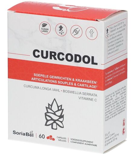 Complément alimentaire à utiliser dans le cadre d’une alimentation variée, équilibrée et d’un mode de vie sain.Complément alimentaire à base de curcuma et d'oliban qui contribue au maintien des articulations souples.Composition:Extrait bio-optimalisé de curcuma 300 mg (25:1) (BCM-95®), extrait sec de Boswellia serrata 200 mg (10:1) (AKBAMAX®), liant: cellulose microcristalline, lubrifiants: stéarate de magnésium, dioxyde de silicium, capsule: hydroxypropylméthylcellulose.Valeur nutritionnelle: Pour 2 gélulesCurcuminoïdes totales516 mgCurcumine390 mgAcides boswelliques 280 mgHuile essentielle de curcuma54 mgAKBA 40 mgConseil d'utilisation:Aigue : 1 gélule le matin et 1 gélule le soir.Chronique : 1 gélule le matin.Précautions d'emploi:Ne pas dépasser la dose recommandée. Ne pas laisser à la portée des jeunes enfants, À conserver à une température inférieure à 25°C, à l’abri de la lumière, de la chaleur et de l’humidité.Poids net:36 g = 60 gélulesFabricant:SORIA BEL, NVRinglaan 35B-8480 IchtegemBelgique ...