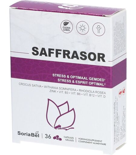 Complément alimentaire à utiliser dans le cadre d’une alimentation variée, équilibrée et d’un mode de vie sain.Saffrasor CTesprit optimaleQu’est-ce que le Saffrasor?Le Saffrasor est une formule complète et unique à base d’extrait de safran à large spectre et standardisé.Grâce à l’effet synergique de 3 plantes (safran, ashwagandha et rhodiole) et plusieurs cofacteurs (vitamine B3, B6, B12, D et zinc), la formule a une triple action très effective:Elle contribue à une humeur optimale1Elle augmente la résistance mentale en cas de stress2Elle donne de l’énergie en cas de fatigue3Les gélules Saffrasor sont faites à base de technologie cyclodextrine. Ceci garantit une bonne assimilation des ingrédients.Par sa composition unique et son dosage élevée, les premiers effets peuvent être remarqués après 1 semaine.Quelle est la composition de Saffrasor?L’extrait de safran, cliniquement étudié, utilisé dans le Saffrasor est produit avec des crocus de safran espagnols de la plus haute qualité. Les fils de safran sont transformés en extrait par un procédé de production breveté qui préserve toutes les propriétés de la plante et permet d’obtenir un extrait complet et équilibré.En plus du Saffran, le Saffrasor contient aussi de l’extrait d’Ashwagandha de haute qualité (KSM-66) et de la Rhodiole qui augmente la résistance mentale face au stress. 2La formule unique contient aussi les formes actives de la vitamine B3, B6, B12, D et du zinc. Ces cofacteurs assurent une efficacité optimale. La vitamine B6 contribue à un métabolisme énergétique normal et à la vitalité générale.3Les gélules sont 100% végétales et ne contiennent pas de charges ou d’excipients synthétiques.Quand l’utiliser?Le Saffrasor peut vous soutenir pendant des périodes stressantes2, émotionnelles1, qui demandent beaucoup d’énergie3. La composition aide à maintenir une humeur optimale1, y compris en période de tristesse, d’idées noires et pendant des phases de vie éprouvantes. Le Saffrasor augmente la résistance mentale pendant des périodes stressantes2. Il réduit la fatigue et soutient le métabolisme d’énergie3.Combien en utiliser?Pour des résultats optimaux, prenez 1 gélule chaque matin. Les premiers effets peuvent être aperçus après 1 semaine. Pour un effet thérapeutique optimal, il faut prendre le Saffrasor pendant au moins 4 à 5 semaines.Bénéfices:Convient à toute la famille, à partir de 12 ans1 prise par jour, le matinPremiers effets après une semaineTechnologie cyclodextrine, pour une assimilation élevéeCombinaison synergique de 3 extraits de plantes et des cofacteurs zinc, vitamine B3, B6, B12 et D pour un soutien optimal.Dosage élevé de safranal et crocineFormule clean labelComposition:Extrait sec d’ashwagandha (Withania somnifera, racine) (8:1) (KSM-66), rhodiola (Rhodiola rosea, racine) (5:1), gélule: hydroxypropylméthylcellulose, gluconate de zinc (zinc), liant: extrait de riz (Oryza sativa), carbonate de calcium, extrait sec de safran (Crocus sativa, pistil) (2:1), nicotinamide (vit. B3),... ...