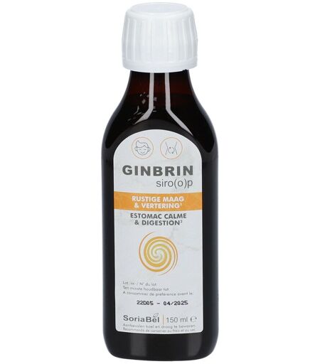 Complément alimentaire à utiliser dans le cadre d’une alimentation variée, équilibrée et d’un mode de vie sain.Sirop Ginbrinestomac calmeQu’est-ce que le sirop Ginbrin? Le Ginbrin est un sirop végétal sans alcool. Sans arômes ni colorants artificiels. Avec de l’extrait de gingembre standardisé qui contribue au fonctionnement normal de l’estomac. Aux extraits de mélisse et de coriandre qui favorisent une bonne digestion.Le sirop contient jusqu’à 2 fois plus de substances actives grâce à l’utilisation d’extraits turbo-dynamiques.Quelle est la composition du sirop Ginbrin? Le sirop Ginbrin contient des extraits fluides turbo-dynamiques patentés de coriandre 800 mg, de mélisse 600 mg, associés à un extrait sec concentré de gingembre 25 mg et d’huiles essentielles naturelles d’origan, de citron, de coriandre et de menthe. Ces extraits végétaux sont 100% naturels, sans alcool et contiennent jusqu’à 2 fois plus d’ingrédients actifs que les extraits fluides traditionnels.Ceci grâce à un processus de production breveté dans lequel toutes les substances actives sont extraites de la plante par différents liquides d’extraction, de sorte qu’un extrait bien équilibré est obtenu.Quand l’utiliser? Le ginbrin peut être utilisée pour soutenir la fonction gastrique et pour faciliter la digestion. Ceci avec un estomac lourd, une digestion difficile, après un repas copieux ou des crampes.Le sirop convient aux enfants à partir de 6 ans.Combien en utiliser? Adultes: 3 x 15 ml (1 cuillère à soupe) par jour Enfants de 6 à 12 ans: 3 x 10 ml (1 cuillère à dessert) par jour, après le repasGrâce à sa forme liquide, le produit est facilement absorbé et a un effet rapide.Bénéfices: Synergie de 3 plantes différentes Effet rapide par sa forme liquide Convient aux enfants Avec des cyclodextrines pour une meilleure assimilation Forme galénique en sirop, facile à utiliser Goût agréable Sans rajout d’aromatisants ou de colorants chimiquesComposition:Mélasse; eau; extraits Turbo-Dynamiques (1:1): coriandre (Coriandrum sativum, semence) 800 mg, mélisse (Melissa officinalis, feuille) 600; ɣ-cyclodextrine; extrait sec de gingembre (Zingiber officinale, rhizome) (5:1) 25 mg; bromélaine 10 mg; acide ascorbique (acidifiant); sorbate de potassium (conservateur); huile essentielle d’origan (Origanum vulgare, parties aériennes); huiles essentielle de citron (Citrus limonum, parties aériennes); huile essentielle de coriandre (Coriandrum sativum, semence); huile essentielle de menthe (Mentha piperita, parties aériennes).Valeur nutritionnelle: Pour 45 ml Gingérol: 7,5 mg Acide rosmarinique 4 mg Bromélaine: 75 GDU Conseil d'utilisation:Adultes: 3 x 15 ml (1 cuillère à soupe) par jour Enfants de 6 à 12 ans: 3 x 10 ml (1 cuillère à dessert) par jour, après le repasPrécautions d'emploi: Ne pas dépasser la dose journalière recommandée. Tenir hors de la portée et de la vue des enfants. Conserver à température ambiante (15 - 25 °C), à l'Abri du soleil.Poids net: 150 mlFabricant: Soria Bel NV Ringlaan... ...