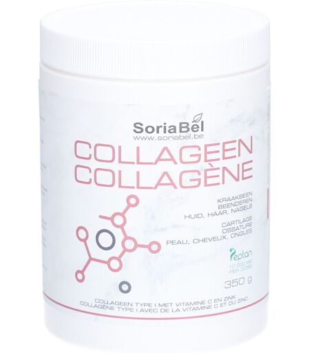 Complément alimentaire à utiliser dans le cadre d’une alimentation variée, équilibrée et d’un mode de vie sain.Qu’est-ce que le COLLAGENE peptan? Le Collagène de Soria contient du collagène peptan®, associé à la vitamine C et au zinc.La vitamine C contribue à la formation normale du collagène pour une fonction normale des os et du cartilage. Le zinc contribue à la formation de protéines et soutient un métabolisme normal des protéines, des lipides et des glucides.Le collagène est une protéine qui apporte la structure, la force et la flexibilité dont notre corps a besoin pour notre mobilité quotidienne. Il nous permet de voyager, de nous déplacer librement, de sauter ou de tomber sans nous blesser. Il protège et relie les parties de notre corps afin de nous soutenir. Le collagène est la protéine la plus importante et la plus abondante dans notre organisme.Le Peptan est une marque leader de peptides de collagène (également connu sous le nom de collagène hydrolysé) sur laquelle de nombreuses études scientifiques ont été menées.Les peptides de collagène sont bioactifs. Cela signifie qu’une fois qu’ils sont absorbés par notre corps, ils peuvent avoir une influence sur nos tissus ou nos cellules. Pour une bonne bio-activité, les peptides doivent être absorbés par nos intestins. Une absorption efficace est cruciale pour que notre corps bénéficie de la supplémentation en peptides de collagène. Elle permet la disponibilité des peptides dans notre circulation sanguine et la transportation vers les tissus cibles.Le Peptan est facilement digestible et parfaitement absorbé. On le retrouve dans la circulation sanguine, déjà dans l’heure après le prise grâce à sa biodisponibilité élevée.Excellente digestibilité + absorption efficace = biodisponibilité élevéeQuand l’utiliser? Le sport exige beaucoup du corps. Chaque effort a un impact sur les muscles. Si on fait de l’exercice régulièrement, il est important de soutenir les muscles. Les protéines aident à maintenir la masse musculaire et contribuent à une croissance normale. Les protéines contribuent au maintien d’une ossature normale. La vitamine C contribue à la formation normale de collagène pour le fonctionnement normal du cartilage. La vitamine C contribue à la formation normale de collagène pour le fonctionnement normal des os. Le zinc contribue au maintien d’os normaux. Le zinc contribue au maintien d’une peau normale, d’ongles normaux et de cheveux normaux.Bénéfices: Contient 18 acides aminés Bio-disponibilité élevée Etudes scientifiques Les protéines contribuent à la croissance de la masse musculaire Les protéines contribuent au maintien de la masse musculaire Composition:Peptides de Collagène Type I (Peptan®) 10 g, vitamine C 40 g, gluconate de zinc (zinc : 5 mg).Valeur nutritionnelle: Par dose quotidienne (10 g) AJR* Collagène (Peptan®) 10 g Vitamine C 40 mg 50 % Zinc 5 mg 50 % Glycine 2,05 g Acide glutamique 1,23 g Proline 1,15 g Hydroxyproline 1,13 g Arginine 0,83 g Alanine 0,81 g Acide aspartique 0... ...
