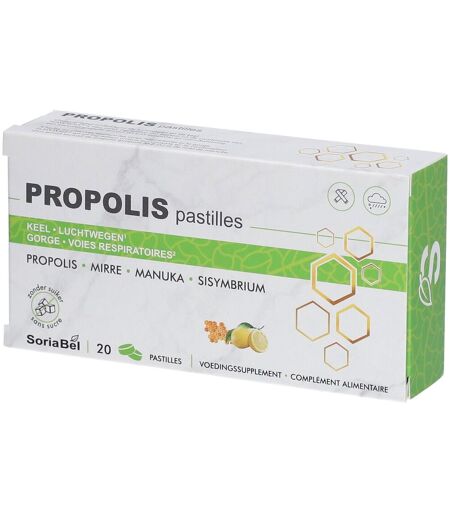 Complément alimentaire à utiliser dans le cadre d’une alimentation variée, équilibrée et d’un mode de vie sain.Soria Natural Propolis Pastilles est un complément alimentaire à base d’extraits de plantes et de propolis, conçu pour soulager les irritations de la gorge et soutenir les voies respiratoires supérieures. La formule contient de la roquette sauvage (Sisymbrium officinale), de l’eucalyptol, du menthol et du Flavoxale® (miel de manuka et propolis), avec un arôme agréable de miel et citron. Sans sucre ajouté, ces pastilles procurent une sensation de fraîcheur tout en adoucissant la gorge.IngrédientsIsomalt (édulcorant), maltitol (édulcorant), jus de citron concentré (Citrus limonum, fruit), extrait sec de roquette sauvage (Sisymbrium officinale, parties aériennes) 40 mg, Flavoxale® (miel de manuka, propolis), extrait liquide de myrrhe (Commiphora myrrha, résine) 12,5 mg, eucalyptol, menthol, arôme de miel, sucralose (édulcorant).Conseils d'utilisationLaisser fondre lentement dans la bouche 3 à 6 pastilles par jour. Ne pas dépasser la dose quotidienne recommandée.Précautions d'emploiÀ conserver dans un endroit sec et sombre à température ambiante (15–25 °C). Tenir hors de portée des enfants. Déconseillé en cas de sensibilité à l’un des ingrédients. Ne remplace pas une alimentation équilibrée et un mode de vie sain.Poids net20 pastillesAdresse du FabricantSoria NaturalCalle El Silo, s/n42162 Garray (Soria)Espagne ...