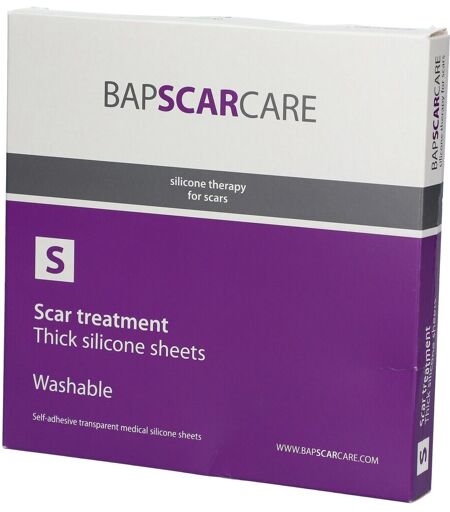 Pansement siliconé BAP SCAR CARE S Pansement médical siliconé auto-adhésif, épais, lavable et transparent, destiné au traitement et à la prévention des cicatrices anormales (hypertrophiques et chéloïdes).BAP SCAR CARE S est un pansement siliconé auto-adhésif, épais, lavable et transparent, utilisé pour le traitement des cicatrices anciennes ou récentes. Le pansement BAP SCAR CARE S est lavable et peut être utilisé sous les vêtements et associé à un traitement de contention. BAP SCAR CARE S est disponible en boîtes d’un, deux ou quatre pansements.Propriétés Le pansement siliconé BAP SCAR CARE S rend les cicatrices plus lisses, plus souples et plus fines, et il permet de réduire les symptômes (rougeurs persistantes, tiraillements, démangeaisons, mobilité réduite des articulations et gêne esthétique). Le pansement forme une enveloppe protectrice sur la peau. L’épiderme s’en trouve mieux hydraté, et cette meilleure hydratation permet une réparation plus rapide des tissus cicatriciels et de la peau lésée et une diminution des gênes fonctionnelles.Indications Les pansements siliconés BAP SCAR CARE S peuvent être utilisés à la fois sur des cicatrices anciennes et récentes, pour : le traitement et la prévention des cicatrices anormales (hypertrophiques et chéloïdes), le traitement des cicatrices de brûlure, le traitement des cicatrices chirurgicales et gynécologiques, les gênes fonctionnelles persistantes (rougeurs, tiraillements de la cicatrice, démangeaisons, sensations d’inconfort persistants) et la gêne esthétique.Conseils d'utilisationMise en place du traitementIl est recommandé d’augmenter progressivement la durée d’utilisation du pansement en commençant par quelques heures chaque jour au cours de la première semaine jusqu’à atteindre une utilisation continue 24 heures par jour. Cette démarche progressive permet à la peau de s’accoutumer peu à peu. Pour obtenir un résultat optimal, il est recommandé de porter le pansement siliconé aussi longtemps que possible chaque jour.Avant l’application Nettoyer et sécher parfaitement la cicatrice et la peau adjacente. Retirer le produit de son emballage. Le pansement siliconé peut si nécessaire être découpé à la bonne taille. S’assurer que le pansement recouvre l’intégralité de la cicatrice et un pourtour d’environ 2 cm de peau saine. L’épilation de la zone entourant la cicatrice avant l’application favorise une meilleure adhésion et prolonge la longévité du pansement siliconé.Application Retirer la première partie du film protecteur bleu du pansement siliconé et appliquer délicatement la surface auto-adhésive ainsi exposée sur une extrémité de la cicatrice. Retirer la deuxième partie du film protecteur et appliquer délicatement l’autre moitié du pansement siliconé sur la cicatrice. Selon la taille du pansement, renouveler l’opération jusqu’à ce que l’ensemble du pansement ait été appliqué. Si nécessaire, le pansement BAP SCAR CARE S peut être maintenu en place par unebande élastique ou une bande de... ...