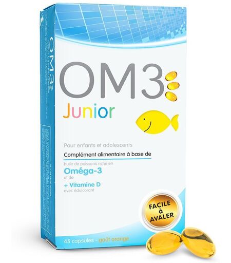 Complément alimentaire à utiliser dans le cadre d’une alimentation variée, équilibrée et d’un mode de vie sain.´Parce que les enfants et les adolescents ont des besoins spécifiques en oméga3 (acides gras dits essentiels car ils ne peuvent pas être fabriqués par l’organisme) OM3 a développé une formule qui leur apporte la dose d’oméga 3 adaptée à leur âge. Pour faciliter la prise, les capsules OM3 Junior sont de petite taille, faciles à avaler. Elles peuvent même être mâchées.Composition:Huile de poissons sauvages (sardines, anchois) concentrée (60% d’oméga-3) ; tunique de la capsule (humectant : glycérol, gélatine, eau purifiée, édulcorant : xylitol, arôme, gélifiant : poudre de cellulose, colorants carmins) ; édulcorant : xylitol ; épaississant : silice colloïdale ; arôme ; antioxydant : extraits riches en tocophérols ; émulsifiant : lécithine de colza ; antioxydant : extrait de romarin ; eau purifiée ; Vitamine A ; vitamine D.Valeur nutritionnelle: Par capsule *AJR Pour 4 capsules *AJR OMEGA-3 337 mg 1011 mg EPA 228 mg 654 mg DHA 72 mg 216 mg VITAMINE D 1,25 µg 25 % 3,75 µg 75 % * Apport journalier de référenceConseil d'utilisation: Enfants entre 6 et 10 ans : 1 à 3 capsules par jour. Enfants entre 11 et 15 ans : 3 à 4 capsules par jour. Capsules à avaler ou à mâcher, à prendre le matin avec un jus de fruit, au début d’un repas ou au coucher en complément d’une alimentation équilibrée.Précautions d'emploi:Il est recommandé de respecter les doses conseillées. Déconseillé aux femmes enceintes et allaitantes. Tenir hors de portée des jeunes enfants. A conserver à température ambiante (15 à 25°C) et loin d’une source de chaleur et d’humidité.Poids net: 45 capsules faciles à avalerFabricant: Laboratoires SUPER DIET 185 Boulevard de la Liberté 59000 LILLE FRANCE ...