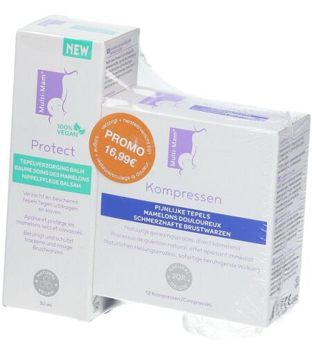 Multi-Mam® CompressesLes compresses Multi-Mam traitent les désagréments de l’allaitement tels que la douleur, le gonflement et la sensibilité des mamelons, avec un effet apaisant et refroidissant direct. Les compresses Multi-Mam forment un coussinet doux et confortable sur le mamelon douloureux. Le principe actif du produit est un gel d’origine végétale hydratant qui forme une barrière physique contre les bactéries nocives et favorise le processus naturel de guérison. Il n’est pas nécessaire de retirer le gel avant l’allaitement.Multi-Mam® Balsam ProtectMulti-Mam Balsam Protect est un baume végan pour mamelons principalement à base d’huiles et de graisses végétales qui protège les mamelons contre la sécheresse et les crevasses pendant l’allaitement. Grâce à sa texture douce et onctueuse, il est particulièrement facile à appliquer, même sur les peaux sensibles. Bien entendu, Multi Mam Balsam Protect est exempt de parfums et d’agents de conservation. Le baume ne nécessite pas d’être retiré avant l’allaitement et est testé dermatologiquement.BénéficesMulti-Mam® CompressesFavorise le processus naturel de guérison.Effet rafraîchissant et apaisant immédiat sur les mamelons douloureux.Améliore l’état de la peau et de la zone du mamelon.À base d’ingrédients naturelsIl n’est pas nécessaire de retirer le gel avant l’allaitement.Multi-Mam® Balsam Protect100% végétalienIngrédients 100% naturelsSans parfums ni conservateursPour restaurer la barrière cutanée naturelleApaise et protège les mamelons secs et craquelésIndicationMulti-Mam® CompressesTraitement des mamelons douloureuxMulti-Mam® Balsam ProtectApaise les mamelonsApplicationMulti-Mam® CompressesÀ quel moment utiliser la compresse Multi-Mam, avant ou après l’allaitement ?Nous vous recommandons d’utiliser la compresse Multi-Mam juste après l’allaitement : si elle est utilisée juste avant celui-ci, l’hydratation peut rendre la prise du sein plus difficile pour votre bébé.Combien de temps dois-je garder la compresse Multi-Mam sur ma poitrine ?Idéalement pendant 30 minutes ; mais au minimum 10 minutes et au maximum une heure.Combien de fois puis-je utiliser une compresse Multi-Mam ?Chaque compresse est à usage unique. Elle doit être jetée après usage pour des raisons d’hygiène.Si mon bébé avale une partie du gel des compresses Multi-Mam, cela peut-il être dangereux ?Non, le gel est sans danger pour votre bébé. Il n’est pas nécessaire d’enlever l’excédent de gel avant l’allaitement.Multi-Mam® Balsam ProtectDois-je retirer le Multi-Mam Balsam Protect avant l’allaitement ?Non, le Multi Mam Balsam Protect est inoffensif en cas d’ingestion et a un goût et une odeur neutres. Il est particulièrement recommandé d’appliquer le baume immédiatement après l’allaitement. S’il est appliqué juste avant l’allaitement, il peut rendre la prise du sein difficile pour votre bébé.À quelle fréquence devrais-je utiliser le Multi-Mam Balsam Protect ?Aussi souvent que vous le souhaitez. Nous recommandons d’appliquer le baume... ...
