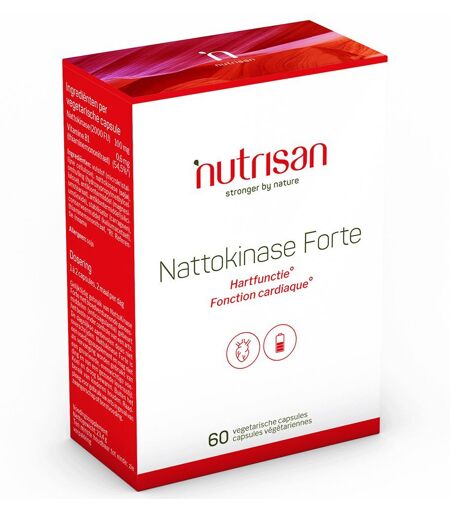 Complément alimentaire à utiliser dans le cadre d’une alimentation variée, équilibrée et d’un mode de vie sain.Nattokinase Forte contient une forme très stable et active de nattokinase qui ne contient pas de vitamine K2. L’enzyme nattokinase est naturellement dans le natto (fèves de soja fermentées), un plat japonais traditionnel.La vitamine B1 favorise la fonction normale du cœur et contribue à avoir une énergie métabolique normale. Composition:Agent de charge (cellulose microcristalline), nattokinase (soja), enrobage (hydroxypropylméthylcellulose), anti-agglomérant (stéarate de magnésium), anti-agglomérant (dioxyde de silicium), stabilisant (carraghénanes), conservateur (acétate de potassium), mononitrate de thiamine.Valeur nutritionnelle: Pour 1 capsule AJR* Nattokinase (2000 FU) 100 mg Vitamine B1 (mononitrate de thiamine) 0,6 mg 54,5% *Apport journalier de références Conseil d'utilisation:1 à 2 capsules, 2 fois par jour.Précautions d'emploi:L’emploi simultané de NattoKinase Forte et des médicaments anticoagulants se fait de préférence sous le contrôle d’un médecin ou d’un spécialiste. Ne pas dépasser la dose journalière recommandée. Conserver dans un endroit sec et frais. Tenir hors de portée des enfants. Consultez votre médecin en cas de grossesse ou d’allaitement.Poids net: 23,4 g = 60 capsulesFabricant: nutrisan Oude Molenstraat 949100 Sint-Niklaas ...