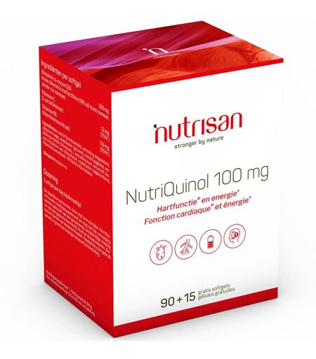 Complément alimentaire à utiliser dans le cadre d’une alimentation variée, équilibrée et d’un mode de vie sain.NutriQuinol est un complément alimentaire nouvelle génération à base de coenzyme Q10 de forme réduite (ubiquinol). Cette coenzyme Q10 est bioactive, tout comme la coenzyme Q10 produite par l'organisme. NutriQuinol ne présente pas d'impact sur la fabrication de coenzyme Q10 par l'organisme. Grâce à la présence d'huile à base de lécithine, NutriQuinol est parfaitement assimilable. La formule de NutriQuinol est également complétée avec de la vitamine B1 et de la vitamine C :La vitamine B1 aide au fonctionnement normal du cœur.La vitamine C soutient la bonne formation du collagène pour encourager le fonctionnement normal des vaisseaux sanguins.Enfin, la vitamine B1 favorise le métabolisme énergétique, tandis que la vitamine C contribue à faire diminuer la fatigue. IndicationAdultes de plus de 45 ansComposition:Huile de colza (agent de charge), gélatine de poisson (enrobage), huile de soja (agent de charge), ubiquinol, glycérine (enrobage), cire d’abeilles (épaississant), acide-L-ascorbique, caramel (colorant), lécithine (stabilisateur), vitamine B1Valeur nutritionnelle: Par gélule*AJRUbiquinol (co-enzyme Q10 réduite) (Kaneka QHTM) dans une matrice d’huile avec de la lécithine (98% de l’isomère all-trans, sans isomère cis)100 mg-Vitamine C (acide L-ascorbique)12 mg15 %Vitamine B1 (mononitrate de thiamine)0,6 mg55 %*Apport journalier de référenceConseil d'utilisation:1 gélule par jour pendant le repasPrécautions d'emploi:Ne pas dépasser la dose journalière recommandée. Garder hors de la porté des jeunes enfants. Consulter un médecin en cas de grossesse ou d'allaitement.Poids net:84 g = 105 gélulesFabricant:Nutrisan nvOude Molenstraat 949100 Sint-NiklaasBelgique ...