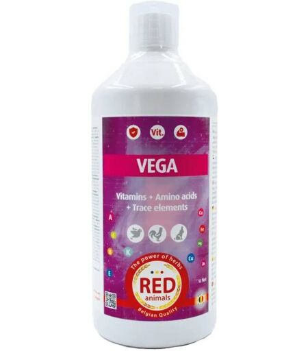 Vega vitamines volailles, pigeons et lapins 0,25 L - 0,5 L et 1 L Red animals Pour maintenir vos volailles, pigeons ou lapins en pleine forme, essayez ces vitamines de la gamme Vega. Ce complément alimentaire est complet et équilibré. Complexe hyper concentré de vitamines, acides aminés et sels minéraux. À lui seul, il ne contient pas loin de 10 vitamines, 15 acides aminés, 5 électrolytes, 3 oligo-éléments et 4 acides organiques. Si vos volailles et pigeons sont en pleine reproduction, en phénomène de ponte, en pleine croissance, en période de mue ou ont suivi une cure d'antibiotiques, c'est le moment idéal. Testez-la, et vous verrez la différence ! Comment doser ces vitamines ? Versez 10 ml par litre d'eau ou 20 ml par kg de graines 2 à 3 fois par semaine pendant l'élevage, la mue ou les concours et cela toute l'année. Vendu en contenance 0,25 L - 0,5 L et 1 L Marque : Red Animals Caractéristiques Vega vitamines pour volailles, pigeons et lapins : Composition : monopropylène glycol/chlorure de sodium/sulfate de magnésium monohydraté ; Additifs (par L) Additifs nutritionnels : Vitamines, provitamines : Vitamine A (5E672) : 2 500 000 U.I./Vitamine D (E671) : 500 000 U.I./Vitamine E : 5000 mg/Vitamine B1 : 1000 mg/Vitamine B2 : 2000 mg/Vitamine B6 : 2000 mg/Vitamine B12 : 10 mg/Vitamine C : 3000 mg/Vitamine K3 : 1000 mg/Biotine : 2000 µg. Composés d'oligo-éléments : 600 mg zinc - sulfate de zinc monohydraté - 20 mg fer - sulfate ferreux monohydraté - 600 mg manganèse - sulfate manganeux monohydraté. Acides aminés : Alanine : 750 mg/Arginine : 1000 mg/Cystine : 200 mg/Glycine : 3000 mg/Histidine : 525 mg/Isoleucine : 500 mg/Lysine : 5000 mg/Méthionine : 1500 mg/Phénylalanine : 900 mg/Proline : 900 mg/Sérine : 900 mg/Thréonine : 3000 mg/Tryptophane : 600 mg/Tyrosine : 650 mg/Valine : 800 mg. Additifs technologiques : Conservateurs : 4000 mg acide lactique (E270) - 3000 mg citrate de sodium (E331) - 3000 mg proprionate de sodium (E281) - 1500 mg acide ascorbique (E200) - 1000 mg de citrates de potassium (E332) - 0.2 mg acide citrique (E330) Additifs sensoriels : Substances aromatiques : 3500 mg acide glutamique Constituants analytiques et teneurs : Protéine brute : 2. ...