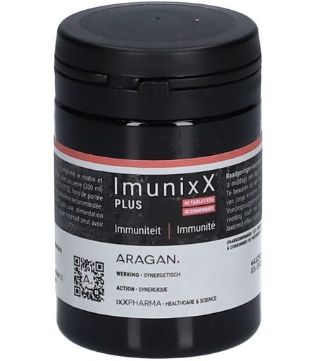 Complément alimentaire à utiliser dans le cadre d’une alimentation variée, équilibrée et d’un mode de vie sain.IMUNIXX PLUS® Beta-glucane breveté & vitamine C ImmunitéIMUNIXX PLUS® est un complément alimentaire spécialement conçu pour accompagner l’organisme lors des périodes de sollicitation accrue. Sa formule associe des nutriments essentiels et des extraits de plantes soigneusement sélectionnés.Imunoglukan® : un ß-1,3/1,6-glucane breveté de haute pureté (95%), largement étudié.Vitamine C : contribue au fonctionnement normal du système immunitaire et à la protection des cellules contre le stress oxydatif.Extrait de sureau : traditionnellement utilisé pour soutenir les défenses naturelles, notamment en cas de refroidissements passagers.Extrait d’andrographis breveté Kamcold® : aide à maintenir le bien-être respiratoire et contribue à la résistance de l’organisme.Extrait de thym : reconnu pour favoriser les défenses naturelles et soutenir la santé des voies respiratoires.IMUNIXX PLUS® peut ainsi être un allié pratique pour renforcer naturellement les mécanismes de défense, en particulier lors des changements de saison.Formule complète pour le soutien de l'immunité et des voies respiratoiresAssociation exclusive de plantes reconnues dans cette indicationMolécule exclusive : Imunoglukan®, un ß-1,3/1,6-glucane breveté très pur (95%), le ß-glucane le plus efficace IngrédientsAgent de charge: sorbitol ; extrait sec de baies de sureau (Sambucus nigra) ; poudre de fleurs et de feuilles de thym (Thymus vulgaris) ; extrait de pleurote en huitre (Pleurotus ostreatus) ; extrait de feuilles de gentiane indienne (Andrographis paniculata) ; bisglycinate de zinc ; arôme naturel: vanille, anti-agglomérant : stéarate de magnésium ; vitamine D3 ; L-sélénométhionine.Données nutritionnellesPour 2 comprimés : Sureau : 240 mg Thym : 200 mg ß-1,3/1,6-glucane : 200 mgKalmcold®(Andrographis) : 160 mgZinc : 9 mg (90 % AR) Sélénium : 8,25 µg (15% AR)Vitamine D3 : 5 µg (100% AR)AR : apport de référenceConseils d'utilisation2 comprimés De préférence à jeun À partir de 12 ansPrécautions d'emploi Conserver dans un lieu sec et frais (15-25°C). Tenir hors de portée des jeunes enfants. Ne pas dépasser la dose recommandée.Une utilisation excessive peut avoir un effet laxatif. Déconseillé aux femmes enceintes.Poids net42 comprimésFabricantixX PHARMABorsbeeksebrug 342600 AnversBelgique ...