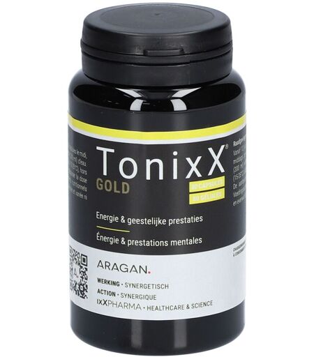 Complément alimentaire à utiliser dans le cadre d’une alimentation variée, équilibrée et d’un mode de vie sain.TONIXX GOLD®   Rhodiola, vitamines B & CoQ10   Fatigue & énergie mentaleTONIXX GOLD® est un complément alimentaire spécialement conçu pour aider à réduire la fatigue et à soutenir les performances mentales. Sa formule associe la rhodiola et un complexe de vitamines B (B1, B6, B8, B12), reconnues pour contribuer à un métabolisme énergétique normal et au maintien de fonctions psychologiques équilibrées.Ce complément se distingue par un dosage élevé en acétyl-L-carnitine, une molécule largement étudiée, ainsi que par la présence de coenzyme Q10, des actifs appréciés pour accompagner l’énergie et la vitalité au quotidien.Association exclusive et hautement dosée pour apporter un soutien en cas de fatigue et favoriser les fonctions psychologiquesDosage des études scientifiquesVitamines sous forme biodisponiblesIngrédientsAcétyl-L-carnitine ; enrobage : hydroxypropylméthylcellulose ; extrait de rhodiola (Rhodiola rosea) ; co-enzyme Q10 (ubiquinone) ; anti-agglomérant : sels de magnésium d’acides gras ; agent de charge : cellulose microcrystalline ; vitamine B1 ; vitamine B6 (pyridoxal-5-phosphate) ; vitamine B8 ; vitamine B12 (méthylcobalamine).Données nutritionnellesPour 4 gélules :Acétyl-L-carnitine : 1400 mgExtrait de Rhodiola rosea : 250 mgCoenzyme Q10 : 100 mgVitamine B1 : 1,1 mg (100% AR)Vitamine B6 : 1,4 mg (100% AR) (pyridoxal-5-phosphate)Vitamine B8 : 300 µg (600% AR)Vitamine B12 : 2,5 µg (100% AR) (méthylcobalamine)AR : apport de référenceConseils d'utilisation2 gélules le matin et 2 gélules le midi À partir de 12 ansPrécautions d'emploi Conserver dans un lieu sec et frais (15-25°C). Tenir hors de portée des jeunes enfants. Ne pas dépasser la dose recommandée.Poids net80 gélulesFabricantixX PHARMABorsbeeksebrug 342600 AnversBelgique ...