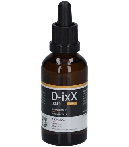 Complément alimentaire à utiliser dans le cadre d’une alimentation variée, équilibrée et d’un mode de vie sain.D-ixX® LIQUID Vitamine D3 200 UI TCM d'huile de coco Absorption optimaleD-IXX LIQUID® apporte de la vitamine D3 sous forme de gouttes faciles à doser, idéales pour contribuer au bon fonctionnement du système immunitaire et au maintien d’os normaux. Chaque goutte fournit 5 µg de vitamine D3 (200 UI), soit 100% des valeurs nutritionnelles de référence.Sa formule repose sur une base d’huile de triglycérides à chaînes moyennes (TCM) issue de l’huile de coco, reconnue pour favoriser une absorption optimale de la vitamine D3 et donc une meilleure biodisponibilité.Goût fruité naturel (arôme fruits rouges)Pipette compte-goutte pratique pour un dosage précis et modulableFlacon compte-goutte de 50 mL, format économique et longue duréeMatrice huile de coco TCM pour une biodisponibilité optimaleApport modulable en vitamine D de 5 à 25 µgFormat économique : 400 jours de cure à posologie maximaleIngrédientsTriglycérides à chaines moyennes d'huile de coco (Cocos nucifera) ; vitamine D3 ; arôme naturel ; antioxydant : tocophérols.Données nutritionnellesPour 1 goutte :Vitamine D3 : 5 µg (100% AR) AR : apport de référenceConseils d'utilisation1 à 5 gouttes par jourPrécautions d'emploi Conserver dans un lieu sec et frais (15-25°C). Tenir hors de portée des jeunes enfants. Ne pas dépasser la dose recommandée.Poids net50 mlFabricantixX PHARMABorsbeeksebrug 342600 AnversBelgique ...