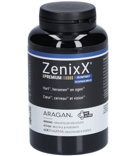 Complément alimentaire à utiliser dans le cadre d’une alimentation variée, équilibrée et d’un mode de vie sain.ZENIXX PREMIUM® Oméga-3 EPA & DHA haute dose + vitamines & minérauxZenIxx Premium® est un complément alimentaire hautement dosé en acides gras oméga-3 EPA et DHA, associés à un complexe de 6 vitamines, 2 minéraux, ainsi qu’à de la quercétine, de la lutéine et de la coenzyme Q10. Sa formule complète a été conçue pour un soutien nutritionnel global.L’EPA et le DHA contribuent à une fonction cardiaque normaleLe DHA et le zinc contribuent au fonctionnement normal du cerveau et de la visionLe sélénium, la vitamine E et le zinc contribuent à protéger les cellules contre le stress oxydatifConvient aux adultes souhaitant renforcer leurs apports en oméga-3 et en micronutriments essentiels.Présentation : pilulier de 90 capsules.Haut dosage en EPA et DHA, formule très riche et complèteCœur, cerveau, vision, protection antioxydanteVitamines sous forme biodisponiblesIngrédientsHuile de poissons sauvages hautement pure et concentrée ; enrobage : gélatine ; humectant: glycérol ; agent raffermissant : cire d’abeille ; eau ; quercétine, vitamine E ; coenzyme Q10, émulsifiant ; lécithine de tournesol ; stabilisant : sorbitol ; bisglycinate de zinc ; vitamine C ; colorant : caramel ; lutéine ; sélénométhionine ; vitamine B12 (méthylcobalamine) ; vitamine A ; vitamine D ; éthylvanilline ; vitamine B9.Données nutritionnellesPour 2 capsules :Huile de poisson : 2160 mg dont EPA : 750 mg dont DHA : 500 mgQuercétine : 50 mgCoenzyme Q10 : 40 mgLutéine : 10 mgVitamine A : 600 μg (75% AR)Vitamine B9 : 200 μg (100% AR)Vitamine B12 : 2 μg (80% AR) (méthylcobalamine)Vitamine C : 25,5 mg (32% AR)Vitamine D : 25 μg (500% AR)Vitamine E : 30 mg (250% AR)Sélénium : 33 μg (60% AR)Zinc : 9 mg (90% AR)AR : apport de référenceConseils d'utilisation2 capsules par jourÀ partir de 12 ansPrécautions d'emploi Conserver dans un lieu sec et frais (15-25°C). Tenir hors de portée des jeunes enfants. Ne pas dépasser la dose recommandée. En cas d’utilisation simultanée de hautes doses de ZenixX PREMIUM et d’anticoagulants, il est préférable de consulter votre médecin.Poids net90 softgelsFabricantixX PHARMABorsbeeksebrug 342600 AnversBelgique ...