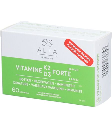 Complément alimentaire à utiliser dans le cadre d’une alimentation variée, équilibrée et d’un mode de vie sain.NOUVELLE FORMULE : quantité plus élevée de vitamine D3 !Cette formule contient du Menaq7 : une vitamine K2 et de la vitamine D3 brevetées, dérivées de la nature et sans allergène ni soja. Alpha Vitamin K2D3 Forte contient de l'huile d'olive qui augmente l'absorption des vitamines K2 et D3 par l'organisme. Les ingrédients dans Alfa Vitamine K2 - D3 Forte contribuent au maintien d'un coeur et d'os normaux ainsi qu'à un taux de calcium normal dans le sang et au maintien d'une fonction musculaire normale*.* La vitamine D contribue au maintien d'os et de muscles normaux et à un taux de calcium normal dans le sang. La vitamine K contribue au maintien d'os normaux.IngrédientsOlea europaea L., (enrobage) gélatine, glycérol et eau, Menaquinone-7, Cholecalciferol.Données nutritionnellesIngrédients par softgelQuantité activeAR*Vitamine K2 (ménaquinone-7)180 mcg240 %Vitamine D3 (cholécalciférol)75 mcg - 3000 IU1500 %Huile d'olive248 mg * AR = Apports de RéférenceNe contient pas d’allergènes.Conseils d'utilisationsDose journalière recommandée1 softgel par jour au cours des repas.Précautions d'emploiConserver dans un endroit frais et sec.Tenir hors de portée des enfants.Ne pas dépasser la dose recommandée.Ne convient pas aux enfants de moins de 11 ans. Attention particulière pour les patients prenant des anticoagulants coumariniques (acénocoumarol, fenprocoumone ou warfarine), car la vitamine K2 a un effet réparateur sur l’artériosclérose. Une vérification régulière de la tension artérielle est recommandée.Consultez votre professionnel de la santé ou votre pharmacien en cas d’utilisation concomitante de médicaments et / ou en cas de doute.Poids net60 softgelsFabricantNutrifarma nvCederstraat 18A2220 Heist-op-den-BergBelgique ...